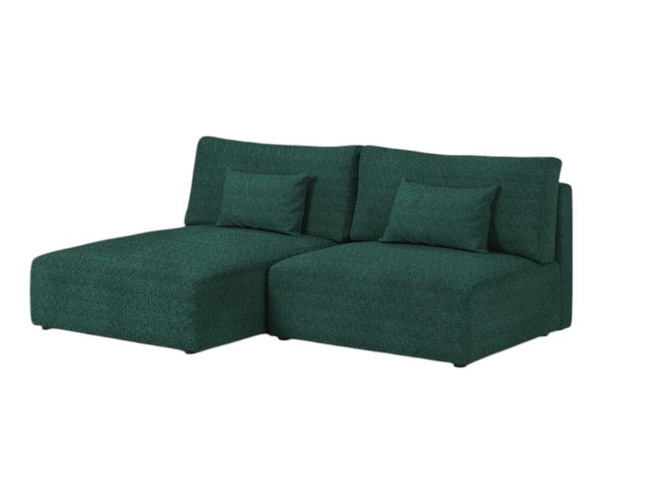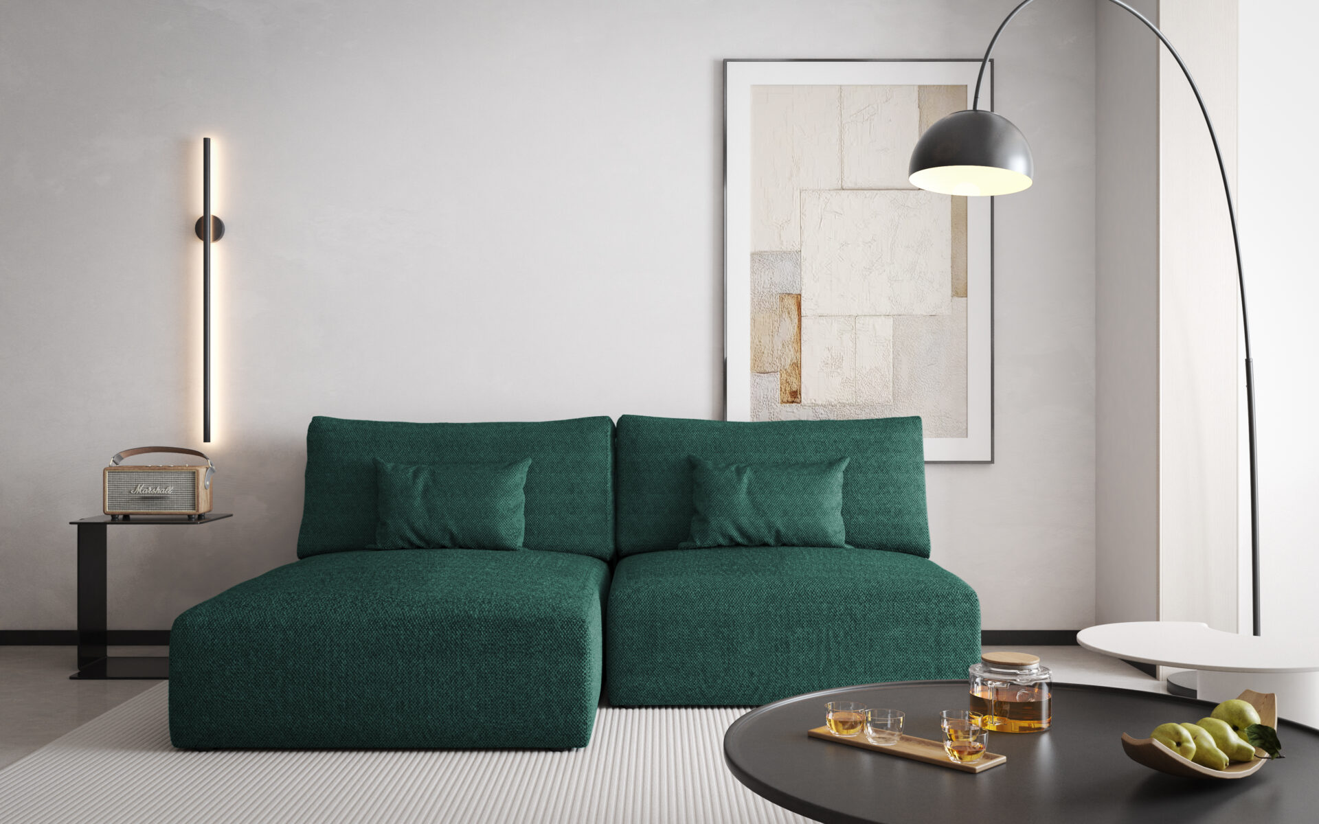 Narożnik Modulo w kolorze butelkowej zieleni to nowoczesny mebel ubrany w elegancki plusz. Jego uniwersalny kształt litery L doskonale organizuje przestrzeń w salonie, tworząc przytulny kącik wypoczynkowy dla całej rodziny. Tapicerowany tył pozwala na ustawienie go w dowolnym miejscu – także na środku otwartego pokoju.