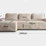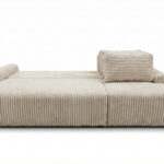 Jego harmonijna forma w kształcie litery L doskonale odnajduje się w nowoczesnych, minimalistycznych i boho wnętrzach. Tapicerowany tył sprawia, że narożnik można swobodnie ustawić na środku salonu, tworząc efektowną strefę wypoczynku. Niskie, czarne nóżki dodają całości delikatnego, współczesnego charakteru.