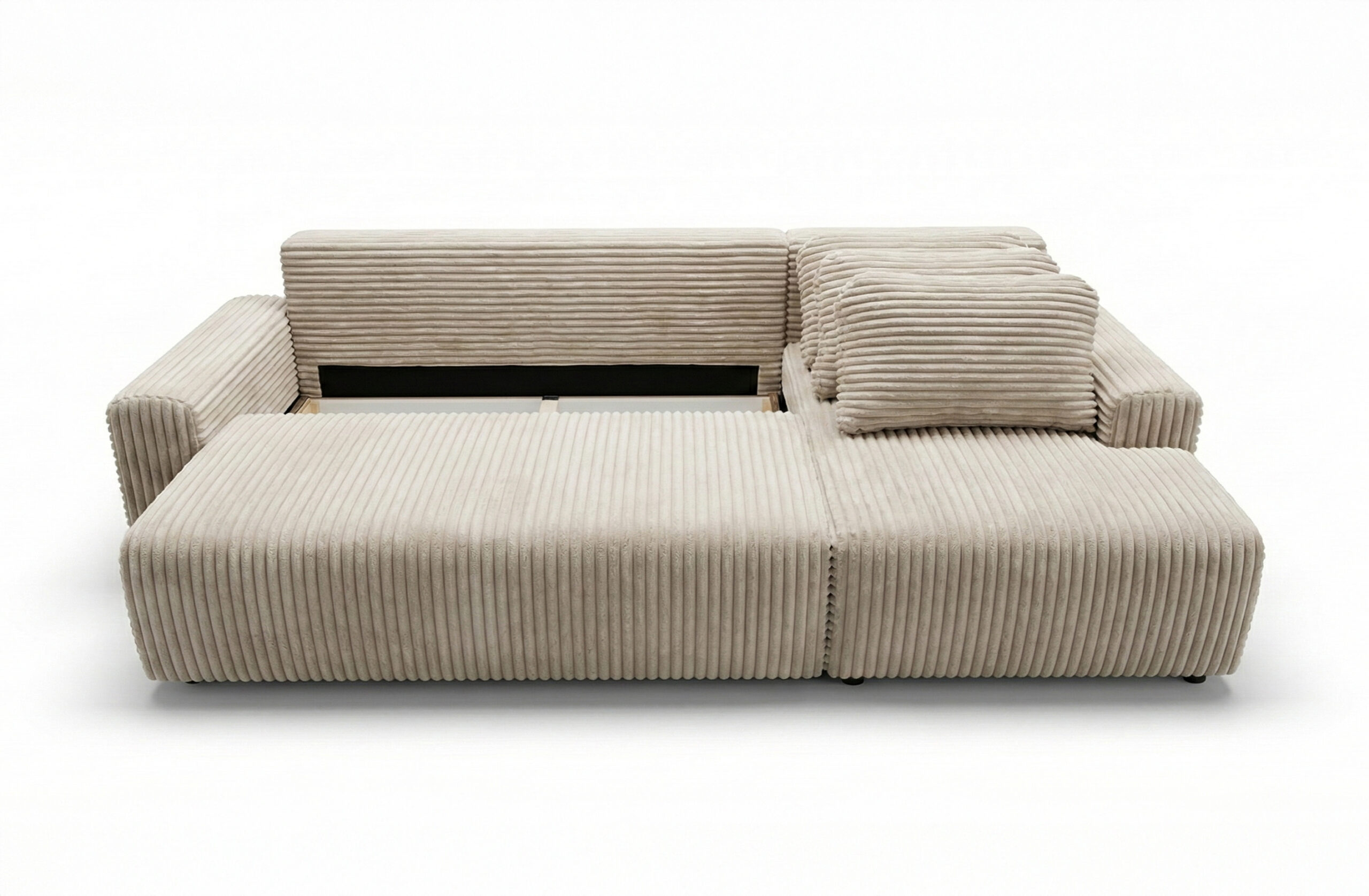 Wyposażono go w intuicyjną funkcję spania, która pozwala łatwo i bez wysiłku przygotować wygodne miejsce dla gości. Pod siedziskiem znajduje się pojemny schowek na pościel, idealny na koce, poduszki czy dodatkowe tekstylia. Utrzymanie porządku w salonie staje się dzięki temu znacznie prostsze.