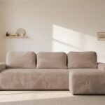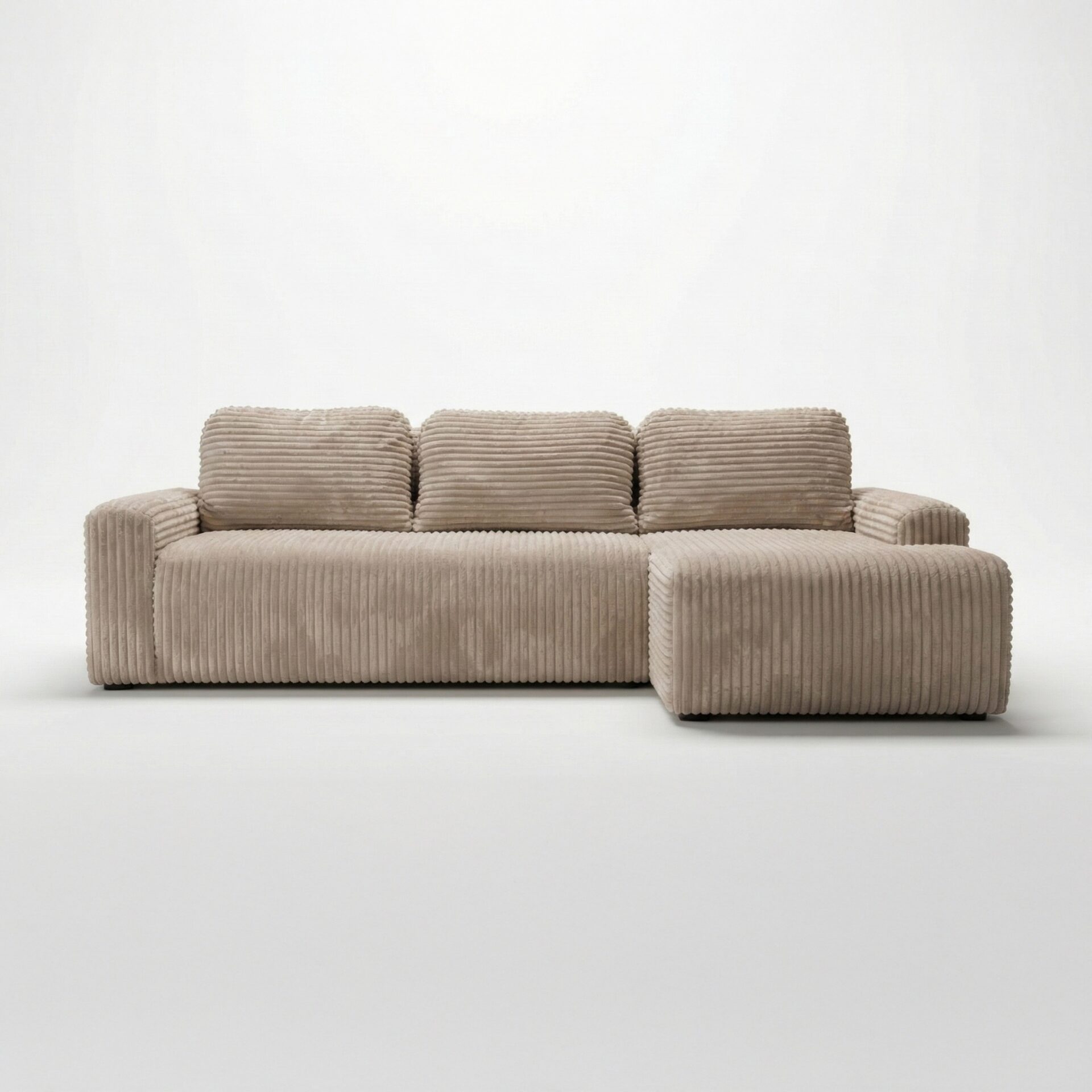 Jego kształt litery L świetnie odnajduje się w nowoczesnych i minimalistycznych wnętrzach. Tapicerowany tył pozwala ustawić mebel w dowolnym miejscu salonu, tworząc przytulną i stylową strefę relaksu. Beżowy kolor sztruksu ociepla przestrzeń i nadaje jej harmonii, a niskie czarne nóżki podkreślają współczesny charakter narożnika.