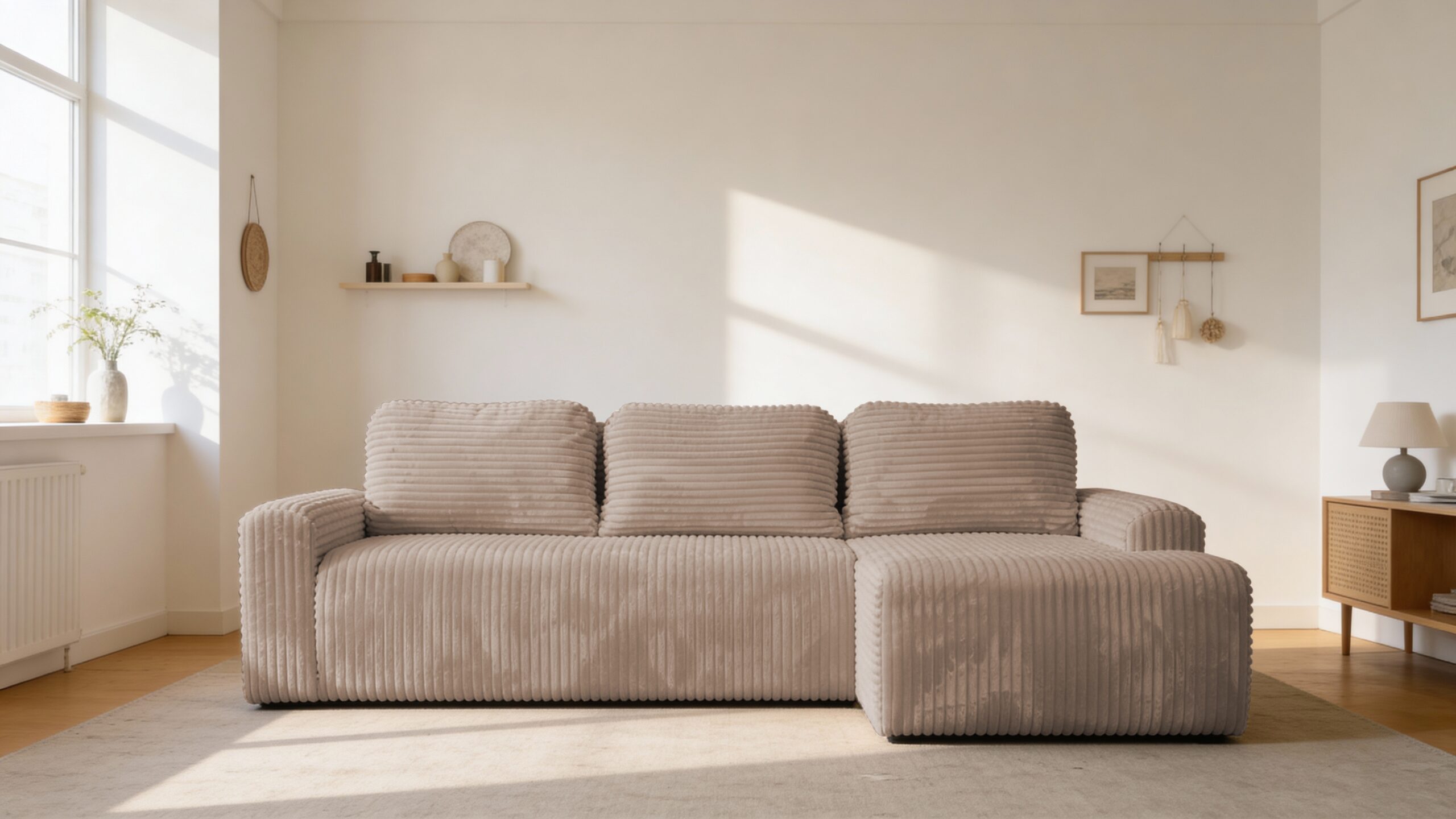 Nesso w beżowym sztruksie to stylowy, wygodny i funkcjonalny narożnik, który wprowadza do wnętrza ciepło i komfort.
