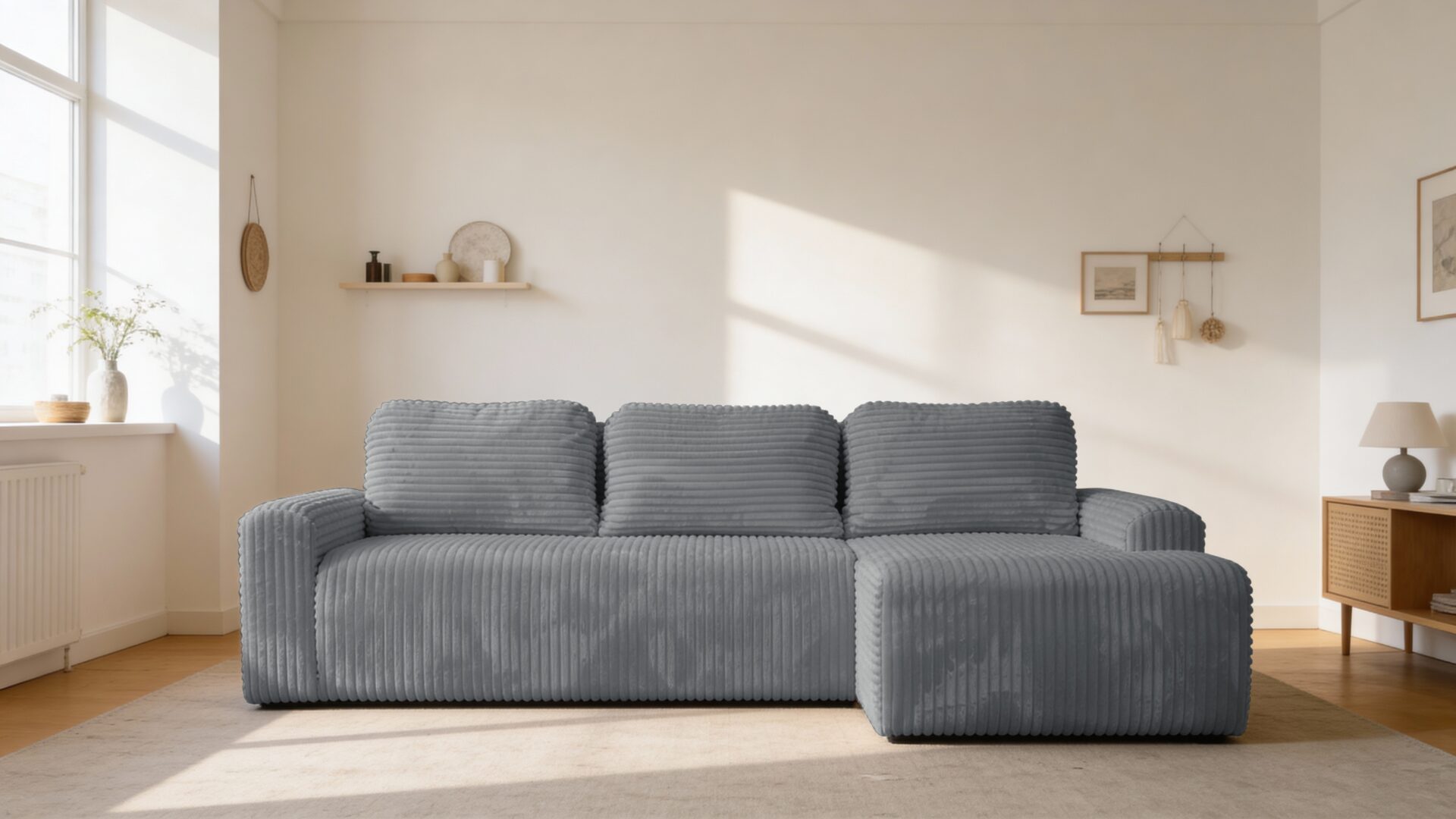 Sztruksowa tkanina podkreśla nowoczesny design i funkcjonalność mebla.