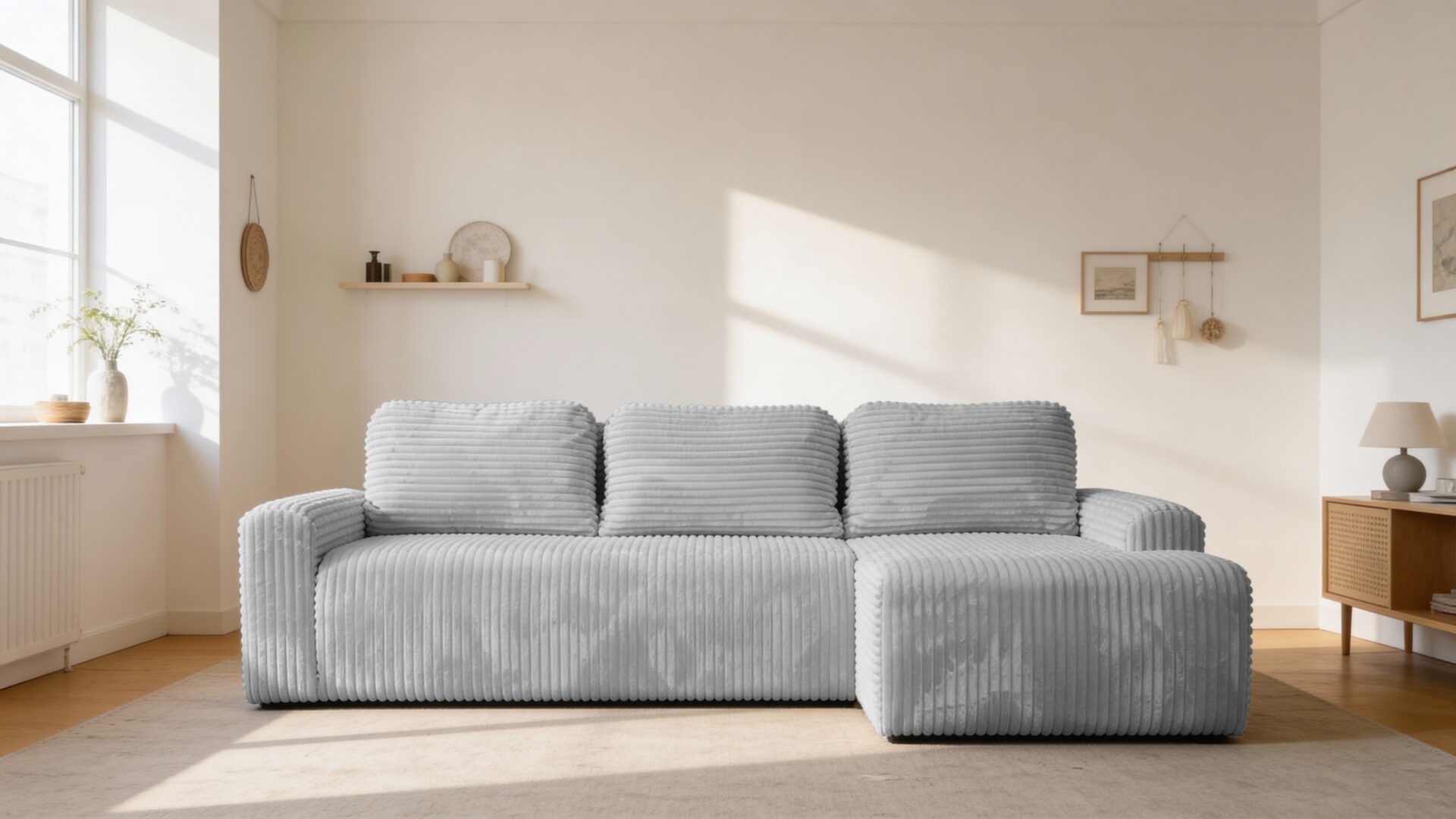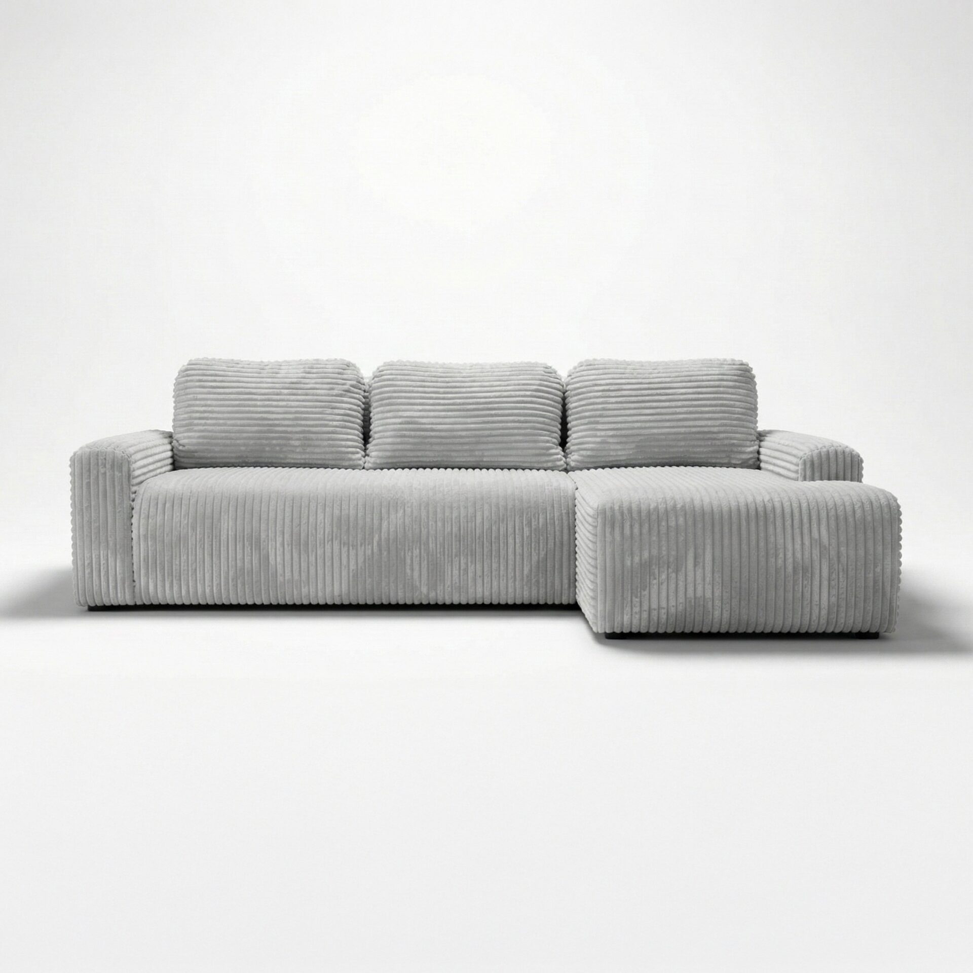 Narożnik Nesso w eleganckim, jasnoszarym odcieniu zachwyca wyjątkowo miękką, sztruksową tkaniną o wyraźnej, przytulnej fakturze.