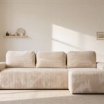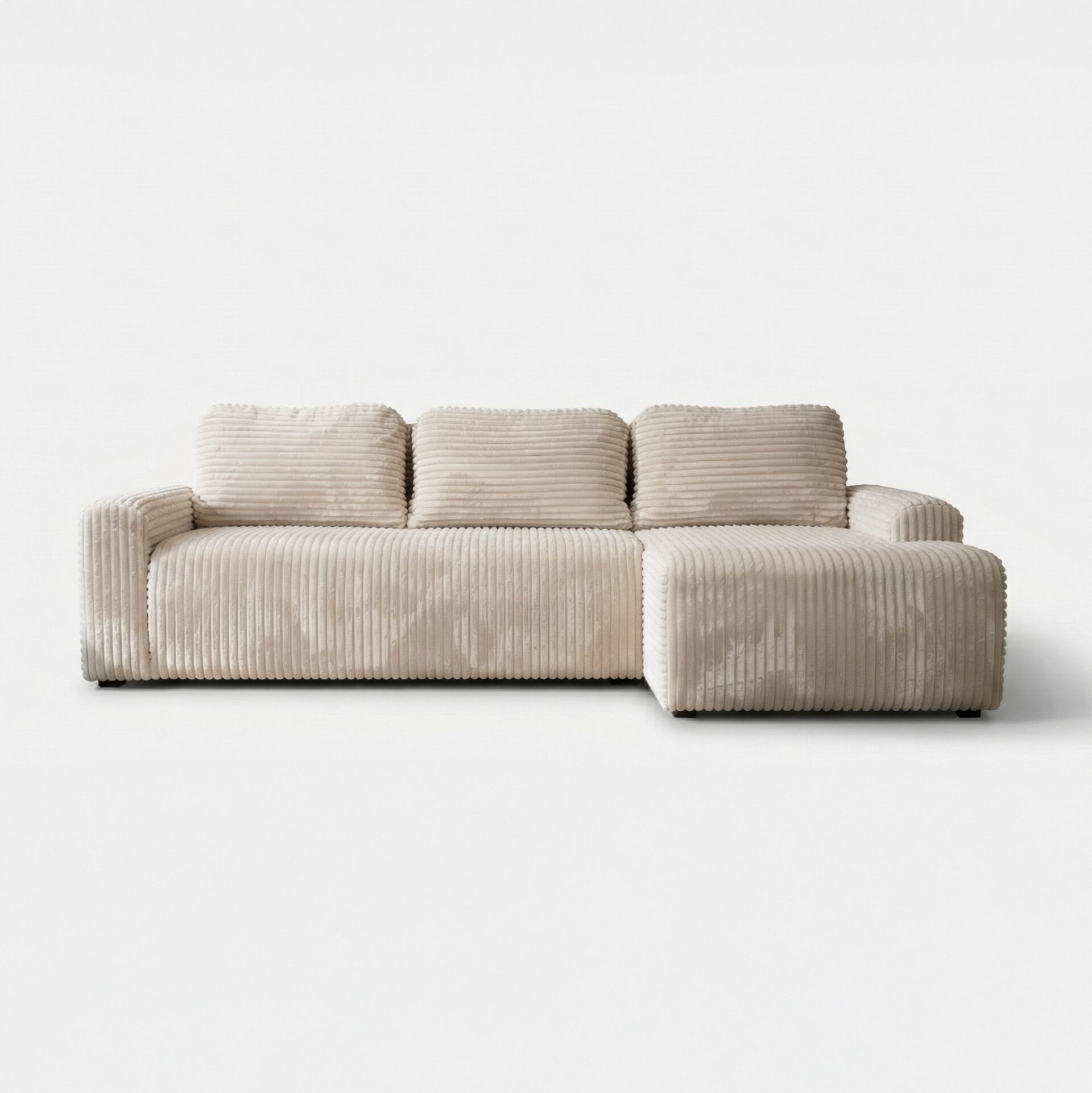 Jego harmonijna forma w kształcie litery L doskonale odnajduje się w nowoczesnych, minimalistycznych i boho wnętrzach. Tapicerowany tył sprawia, że narożnik można swobodnie ustawić na środku salonu, tworząc efektowną strefę wypoczynku. Jasna barwa obicia subtelnie rozświetla przestrzeń i nadaje jej lekkości. Niskie, czarne nóżki dodają całości delikatnego, współczesnego charakteru.