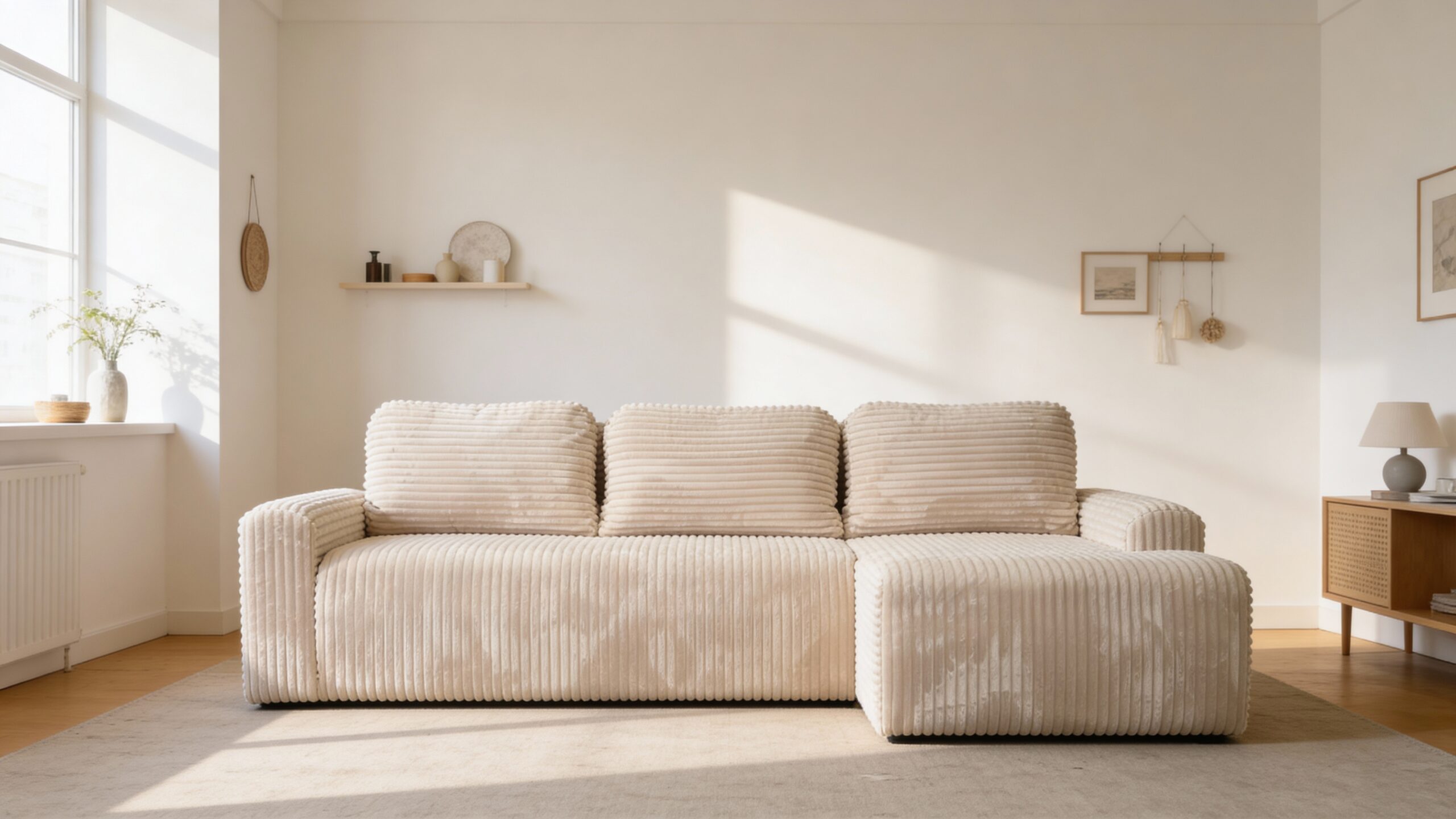 Sztruksowa tkanina podkreśla nowoczesny design i funkcjonalność mebla.