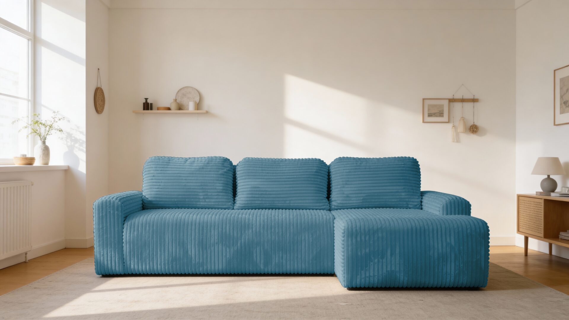 Jego harmonijna forma w kształcie litery L doskonale odnajduje się w nowoczesnych, minimalistycznych i boho wnętrzach. Tapicerowany tył sprawia, że narożnik można swobodnie ustawić na środku salonu, tworząc efektowną strefę wypoczynku. Żywa barwa obicia subtelnie rozświetla przestrzeń i nadaje jej lekkości. Niskie, czarne nóżki dodają całości delikatnego, współczesnego charakteru.