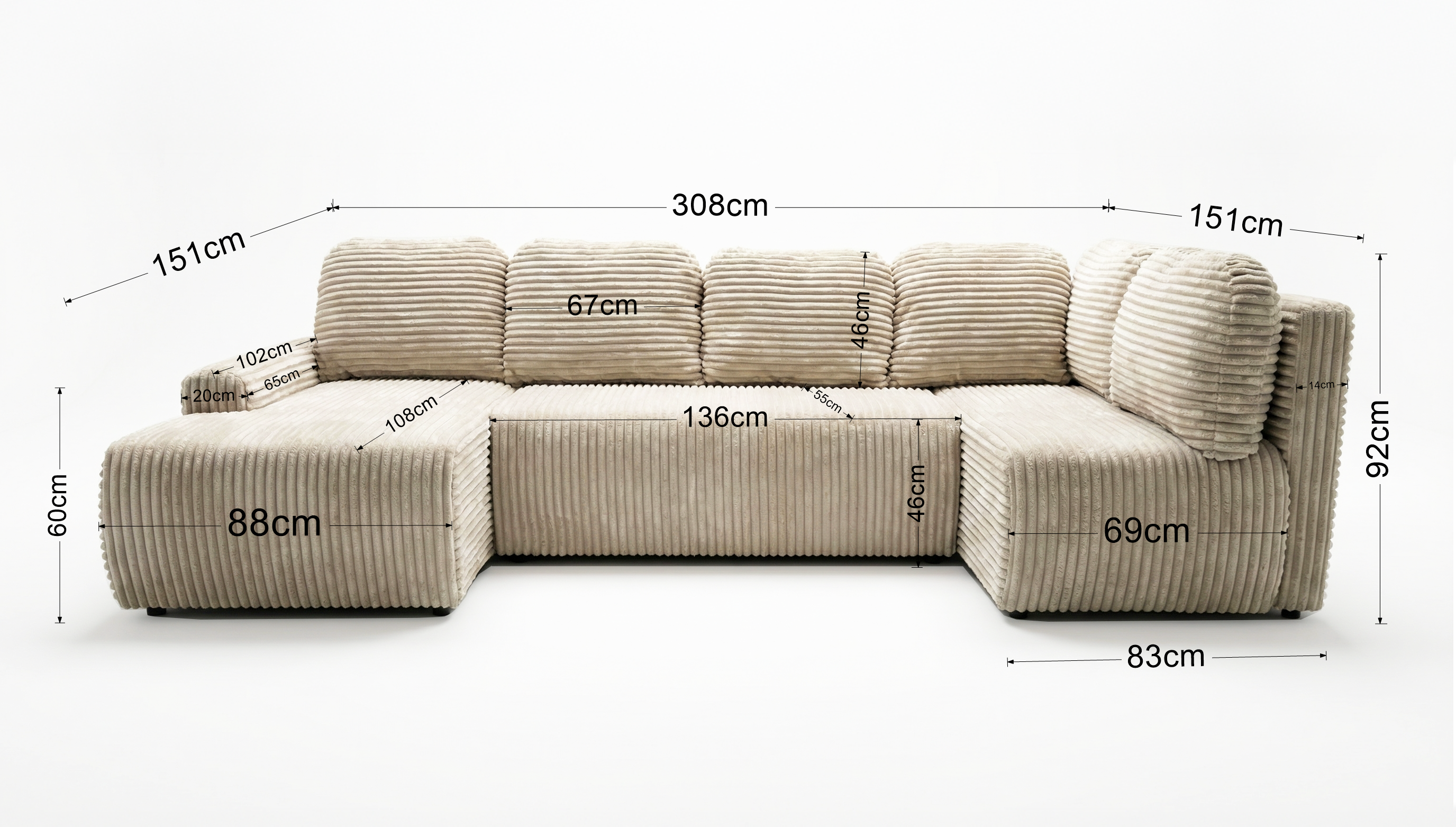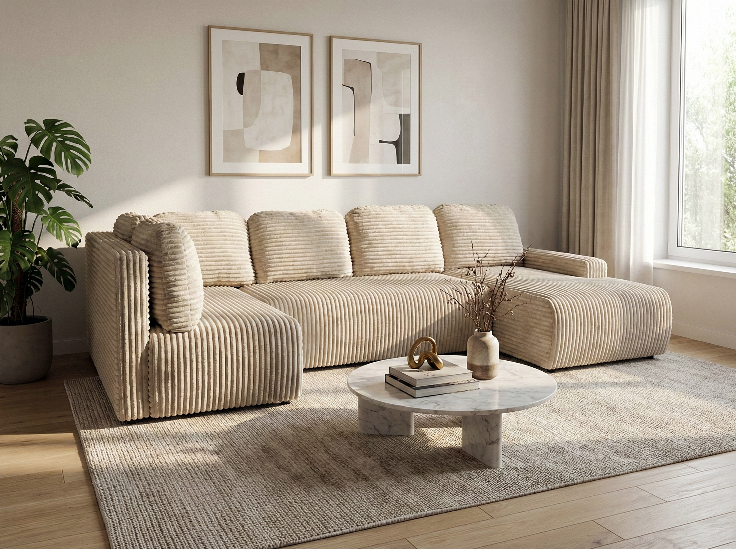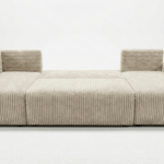 Mebel tapicerowany jest miękką tkaniną o wyrazistej, sztruksowej strukturze, która nadaje całości nowoczesny, a jednocześnie ciepły charakter. Spójna, harmonijna bryła oraz tapicerowany tył umożliwiają ustawienie narożnika zarówno przy ścianie, jak i w centralnej części salonu.