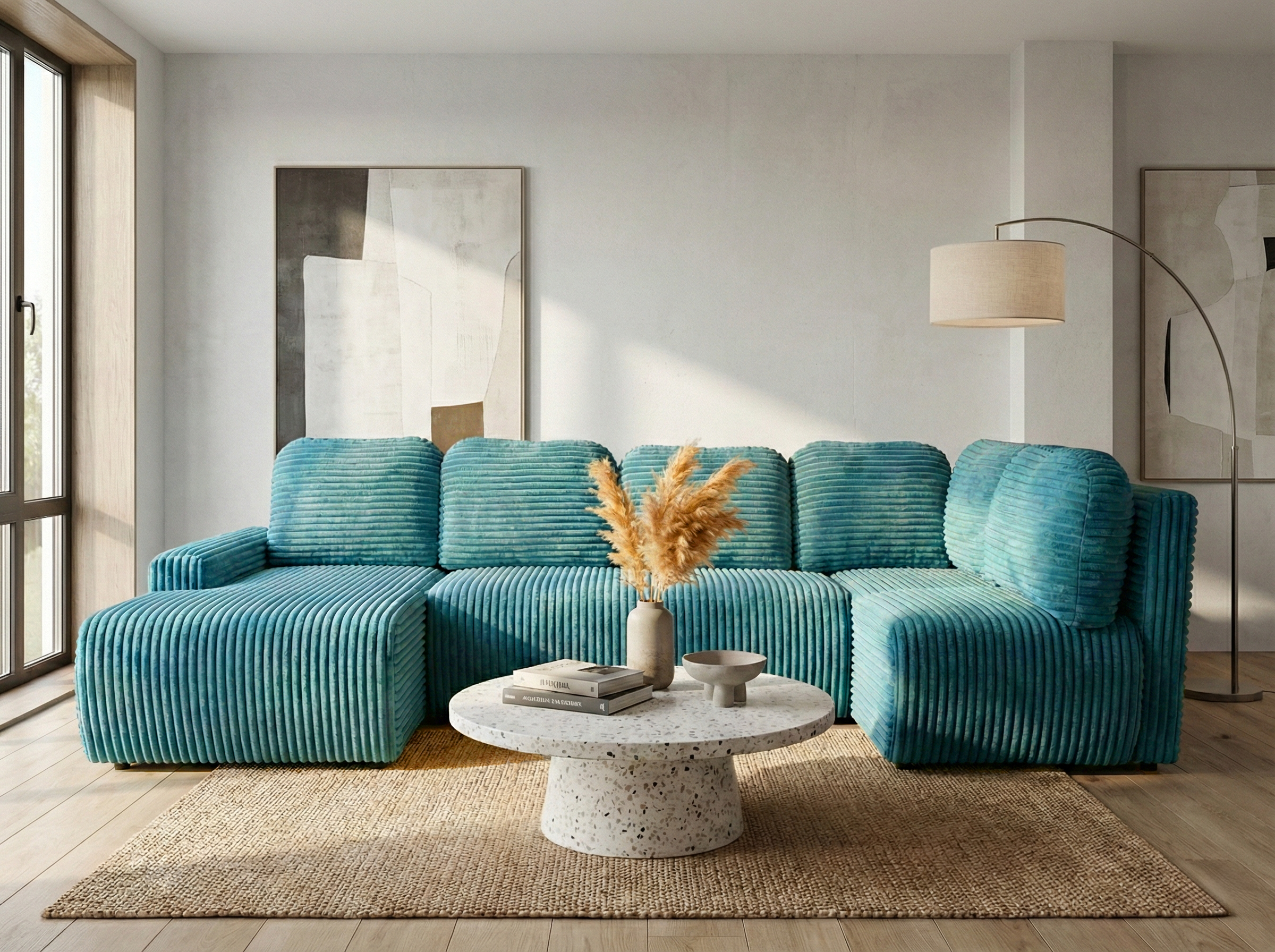 Mebel tapicerowany jest miękką tkaniną o wyrazistej, sztruksowej strukturze, która nadaje całości nowoczesny, a jednocześnie ciepły charakter. Spójna, harmonijna bryła oraz tapicerowany tył umożliwiają ustawienie narożnika zarówno przy ścianie, jak i w centralnej części salonu.