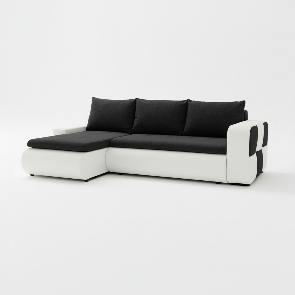 Jego bryła w kształcie litery L doskonale organizuje przestrzeń w salonie. Tworzy wyznaczone miejsce do odpoczynku lub spotkań z bliskimi. Wyrazisty kontrast czerni i bieli nadaje wnętrzu dynamicznego, nowoczesnego charakteru. Dlatego czarno-biały narożnik Bronx świetnie komponuje się z minimalistycznymi lub loftowymi aranżacjami. Co ważne, tapicerowany tył pozwala na ustawienie mebla w dowolnym miejscu. Zyskuje on status centralnego punktu pokoju dziennego.