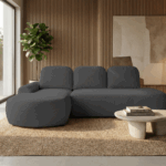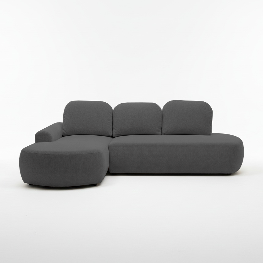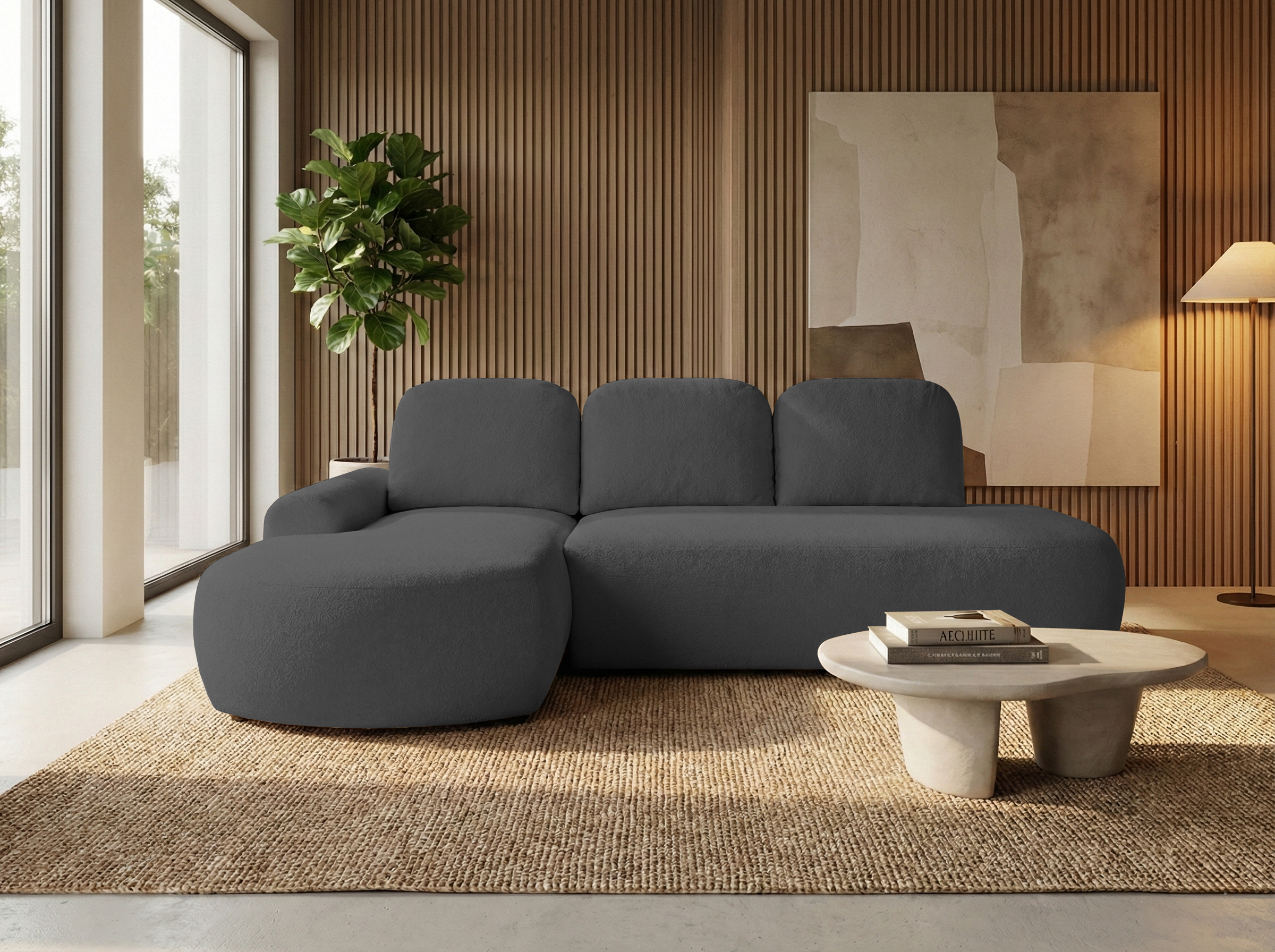 Harmonijna forma narożnika w kształcie litery L zapewnia wygodną przestrzeń do wypoczynku i sprzyja relaksowi po długim dniu. Tapicerowany tył umożliwia swobodne ustawienie mebla w dowolnym miejscu pomieszczenia, również na jego środku, tworząc spójną i estetyczną strefę wypoczynkową. Jego bryła sprawia, że narożnik Ovo z łatwością dopasuje się do różnych stylów wnętrzarskich.