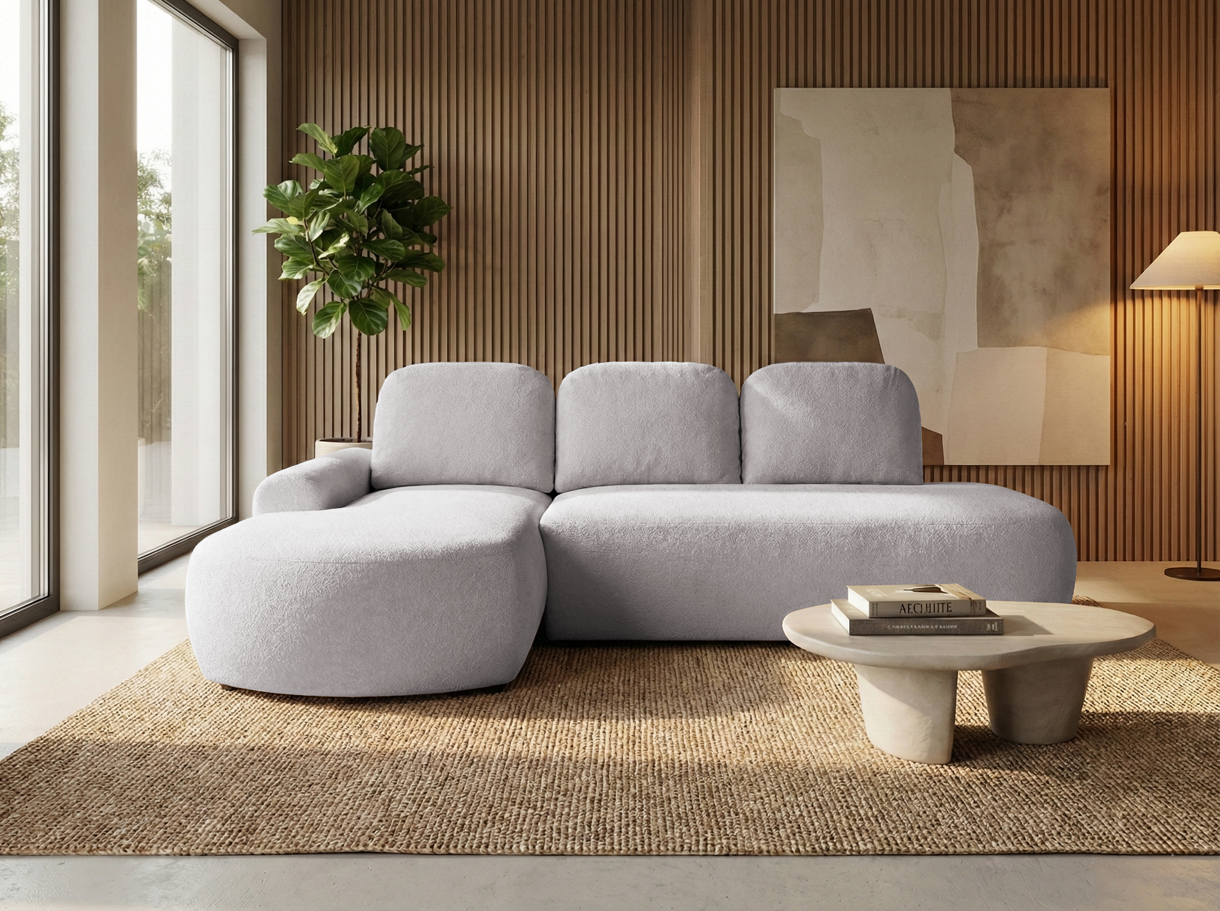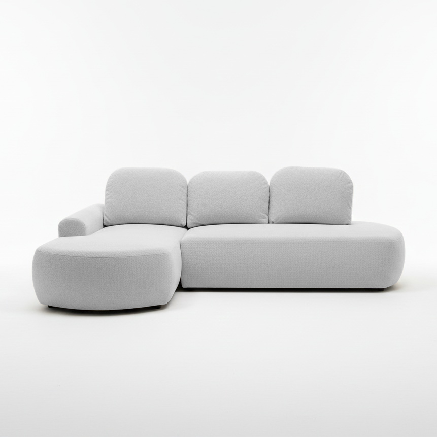 Harmonijna forma narożnika w kształcie litery L zapewnia wygodną przestrzeń do wypoczynku i sprzyja relaksowi po długim dniu. Tapicerowany tył umożliwia swobodne ustawienie mebla w dowolnym miejscu pomieszczenia, również na jego środku, tworząc spójną i estetyczną strefę wypoczynkową. Jego bryła sprawia, że narożnik Ovo z łatwością dopasuje się do różnych stylów wnętrzarskich.