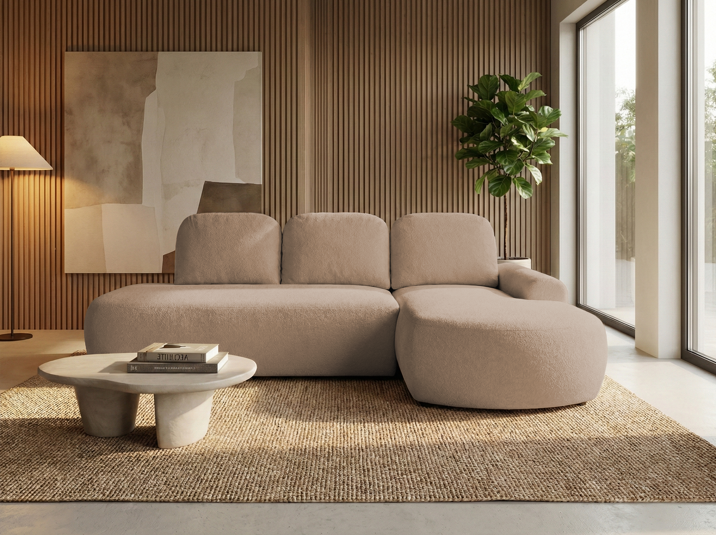 Harmonijna forma narożnika w kształcie litery L zapewnia wygodną przestrzeń do wypoczynku i sprzyja relaksowi po długim dniu. Tapicerowany tył umożliwia swobodne ustawienie mebla w dowolnym miejscu pomieszczenia, również na jego środku, tworząc spójną i estetyczną strefę wypoczynkową. Jego bryła sprawia, że narożnik Cloud z łatwością dopasuje się do różnych stylów wnętrzarskich.