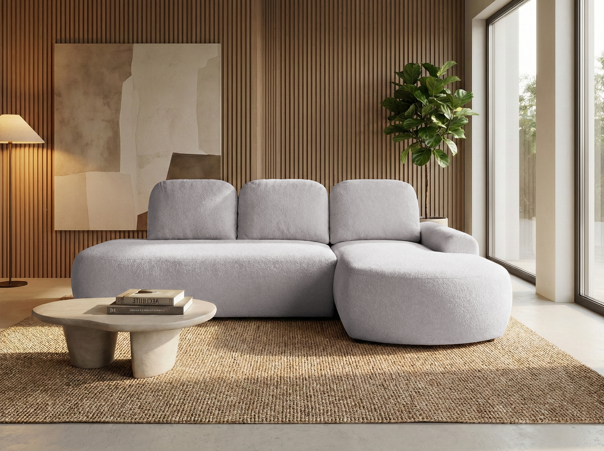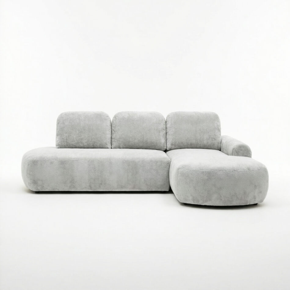 Harmonijna forma narożnika w kształcie litery L zapewnia wygodną przestrzeń do wypoczynku i sprzyja relaksowi po długim dniu. Tapicerowany tył umożliwia swobodne ustawienie mebla w dowolnym miejscu pomieszczenia, również na jego środku, tworząc spójną i estetyczną strefę wypoczynkową. Jego bryła sprawia, że narożnik Cloud z łatwością dopasuje się do różnych stylów wnętrzarskich.