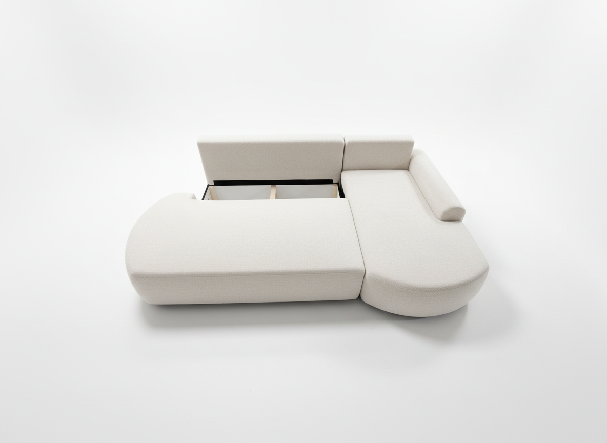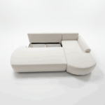 Narożnik Cloud to również praktyczne rozwiązania na co dzień. Wyposażony w automat DL, umożliwia szybkie i bezproblemowe rozłożenie funkcji spania, tworząc komfortową powierzchnię do nocnego wypoczynku. Pod siedziskiem znajduje się pojemny schowek na pościel, który ułatwia przechowywanie koców, poduszek i innych tekstyliów, pomagając utrzymać porządek w salonie.