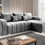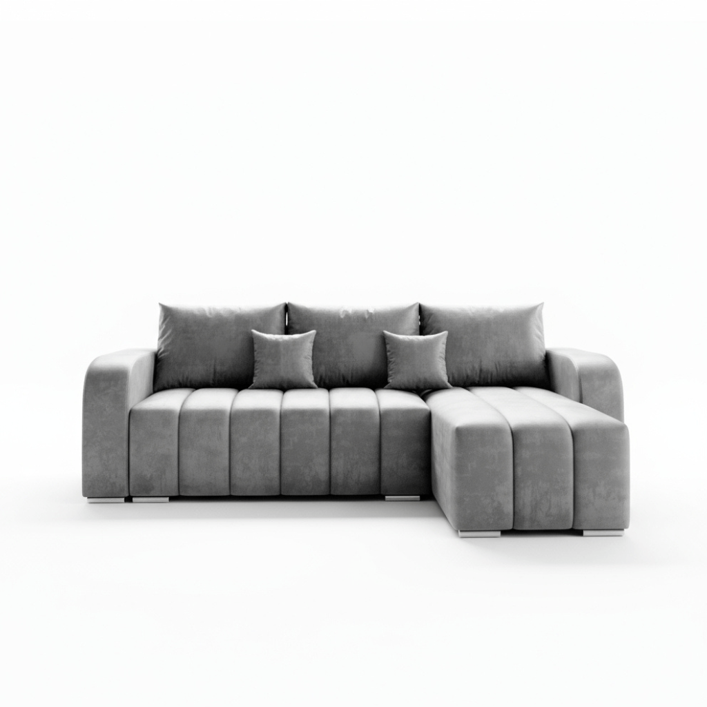 Jego prostą bryłę w kształcie litery L osadzono na niskich, chromowanych nóżkach. Dodają one całości nowoczesnej lekkości. Neutralna szarość tkaniny tworzy w salonie atmosferę spokoju i elegancji. Stanowi idealne tło dla dodatków w dowolnym kolorze. Dzięki temu narożnik świetnie wpisuje się zarówno w klasyczne, jak i minimalistyczne aranżacje. Co ważne, tapicerowany tył pozwala ustawić go w dowolnym miejscu pokoju.