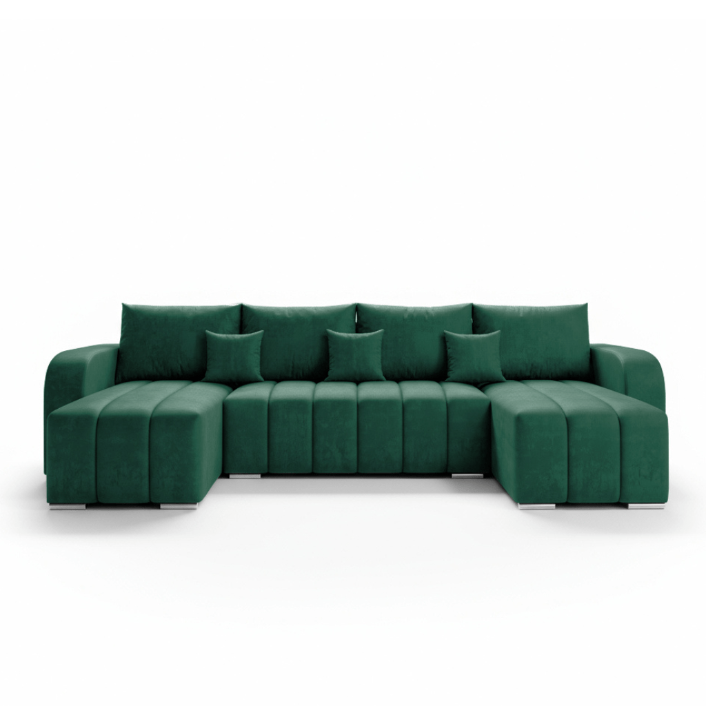 Jego symetryczny kształt litery U tworzy w salonie przytulną strefę relaksu. Mebel doskonale odnajdzie się zarówno w nowoczesnych, jak i klasycznych aranżacjach. Niskie, chromowane nóżki dodają mu lekkości oraz subtelnej elegancji. Co ważne, tapicerowany tył pozwala na ustawienie narożnika w dowolnym miejscu. Może on stać się centralnym punktem pokoju dziennego lub dyskretnie oddzielać strefy w otwartej przestrzeni.