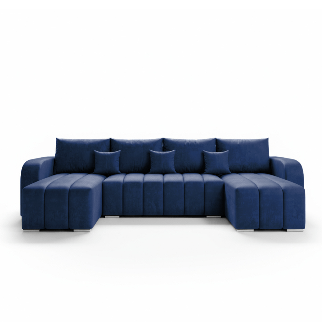 Jego symetryczny kształt litery U tworzy w salonie naturalną strefę do wspólnych spotkań i relaksu. Znaczne rozmiary mebla pozwalają wygodnie spędzać czas całej rodzinie. Głęboki granatowy odcień tapicerki wprowadza do aranżacji spokój oraz subtelne poczucie luksusu. Dlatego narożnik świetnie komponuje się z nowoczesnymi dodatkami i drewnianymi elementami w klasycznym stylu. Całość osadzono na niskich, chromowanych nóżkach, które dodają konstrukcji wizualnej lekkości.