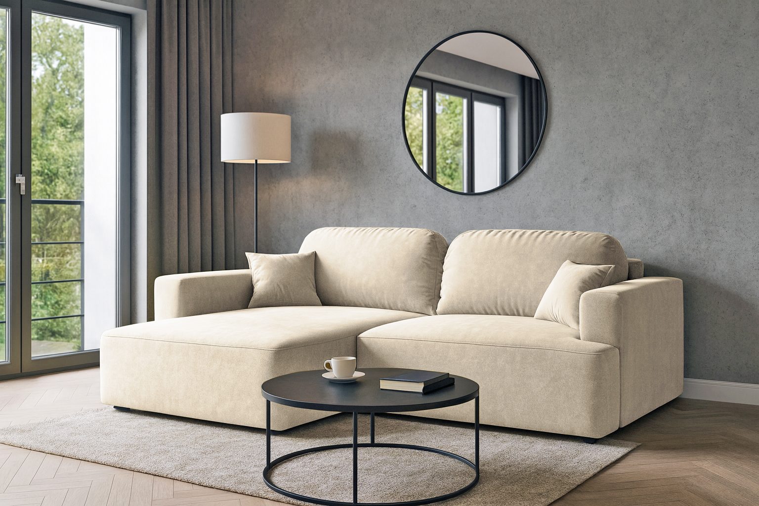 Obicie narożnika wykonano z tkaniny Cloud – przyjemnego w dotyku weluru, który wyróżnia się eleganckim, matowym wykończeniem i subtelną melanżową barwą. To materiał nie tylko piękny, ale również praktyczny – łatwoczyszczący, hydrofobowy oraz odporny na ścieranie, dzięki czemu narożnik długo zachowuje swój atrakcyjny wygląd.