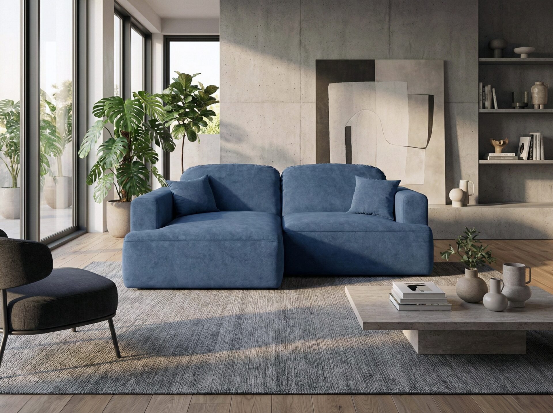 Obicie narożnika wykonano z tkaniny Cloud – przyjemnego w dotyku weluru, który wyróżnia się eleganckim, matowym wykończeniem i subtelną melanżową barwą. To materiał nie tylko piękny, ale również praktyczny – łatwoczyszczący, hydrofobowy oraz odporny na ścieranie, dzięki czemu narożnik długo zachowuje swój atrakcyjny wygląd.