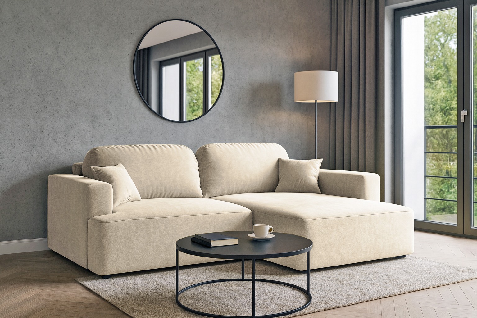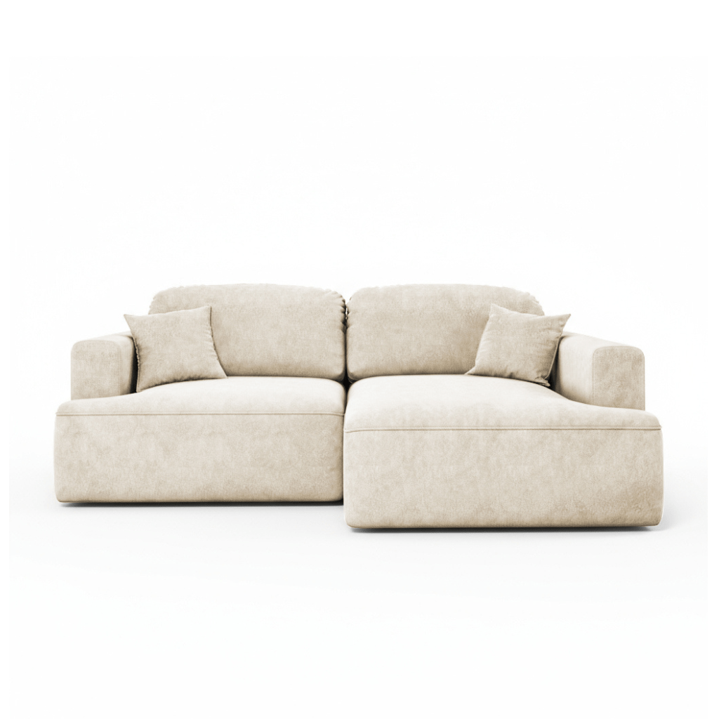 Obicie narożnika wykonano z tkaniny Cloud – przyjemnego w dotyku weluru, który wyróżnia się eleganckim, matowym wykończeniem i subtelną melanżową barwą. To materiał nie tylko piękny, ale również praktyczny – łatwoczyszczący, hydrofobowy oraz odporny na ścieranie, dzięki czemu narożnik długo zachowuje swój atrakcyjny wygląd.
