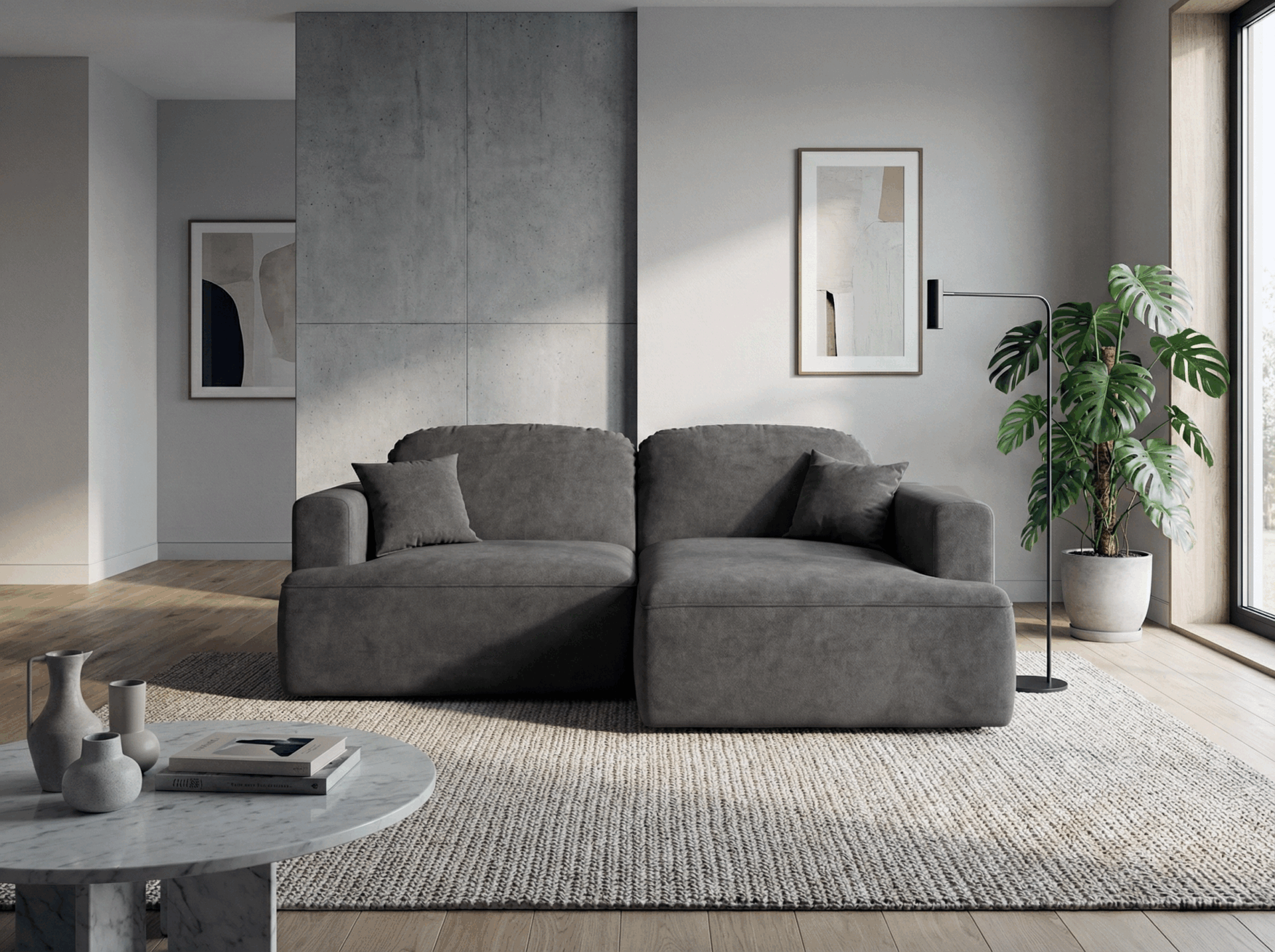 Obicie narożnika wykonano z tkaniny Cloud – przyjemnego w dotyku weluru, który wyróżnia się eleganckim, matowym wykończeniem i subtelną melanżową barwą. To materiał nie tylko piękny, ale również praktyczny – łatwoczyszczący, hydrofobowy oraz odporny na ścieranie, dzięki czemu narożnik długo zachowuje swój atrakcyjny wygląd.