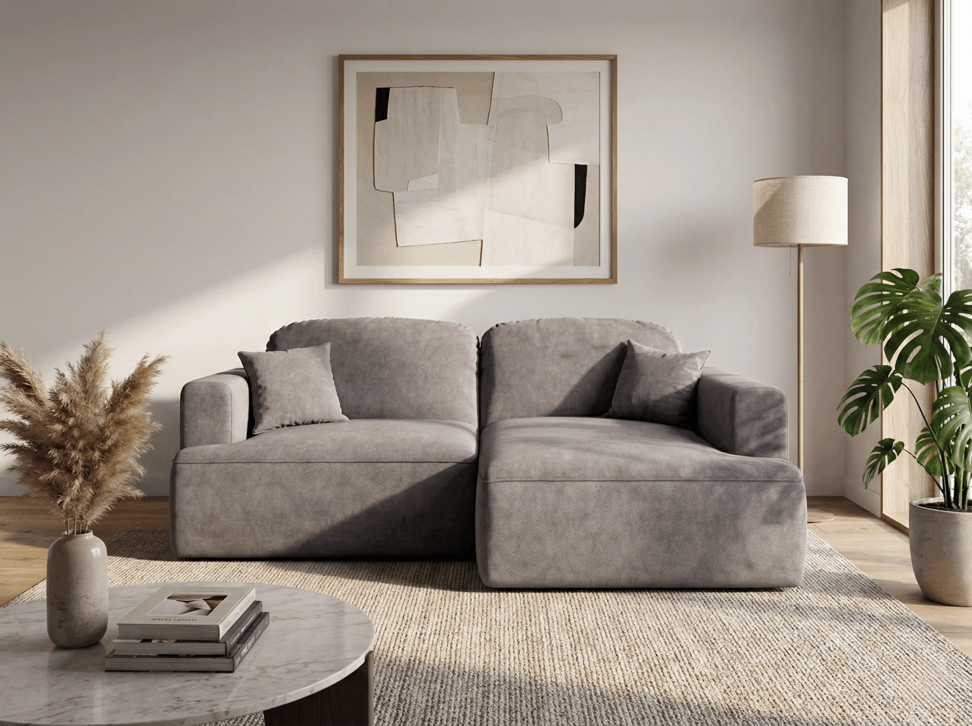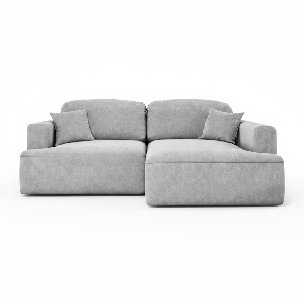 Obicie narożnika wykonano z tkaniny Cloud – przyjemnego w dotyku weluru, który wyróżnia się eleganckim, matowym wykończeniem i subtelną melanżową barwą. To materiał nie tylko piękny, ale również praktyczny – łatwoczyszczący, hydrofobowy oraz odporny na ścieranie, dzięki czemu narożnik długo zachowuje swój atrakcyjny wygląd.