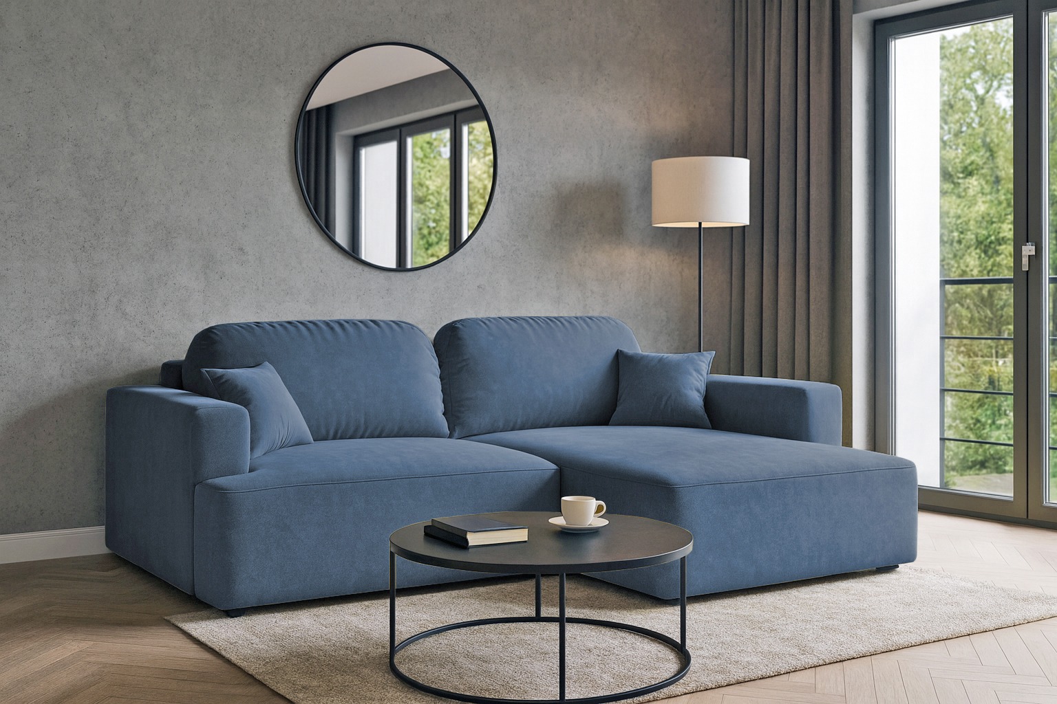 Obicie narożnika wykonano z tkaniny Cloud – przyjemnego w dotyku weluru, który wyróżnia się eleganckim, matowym wykończeniem i subtelną melanżową barwą. To materiał nie tylko piękny, ale również praktyczny – łatwoczyszczący, hydrofobowy oraz odporny na ścieranie, dzięki czemu narożnik długo zachowuje swój atrakcyjny wygląd.