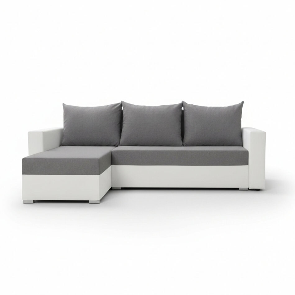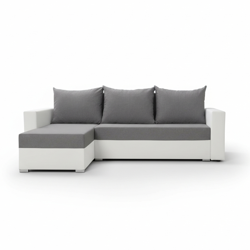 Jego uniwersalny kształt litery L z łatwością wkomponuje się w aranżację salonu. Szaro-biała kolorystyka wprowadza do wnętrza poczucie lekkości, świeżości i spokoju. Dzięki temu mebel staje się idealną bazą dla nowoczesnych lub skandynawskich stylizacji. Tapicerowany tył pozwala na dowolne ustawienie narożnika. Można go umieścić zarówno przy ścianie, jak i w centralnej części pokoju.
