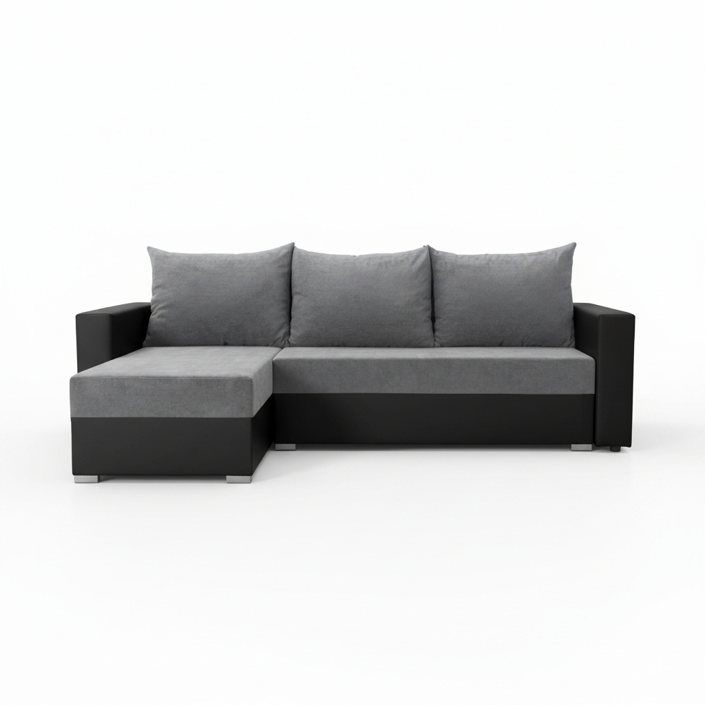 Narożnik z funkcją spania Mojito uniwersalny L-kształtny z pojemnikiem na pościel szara plecionka z czarną ekoskórą