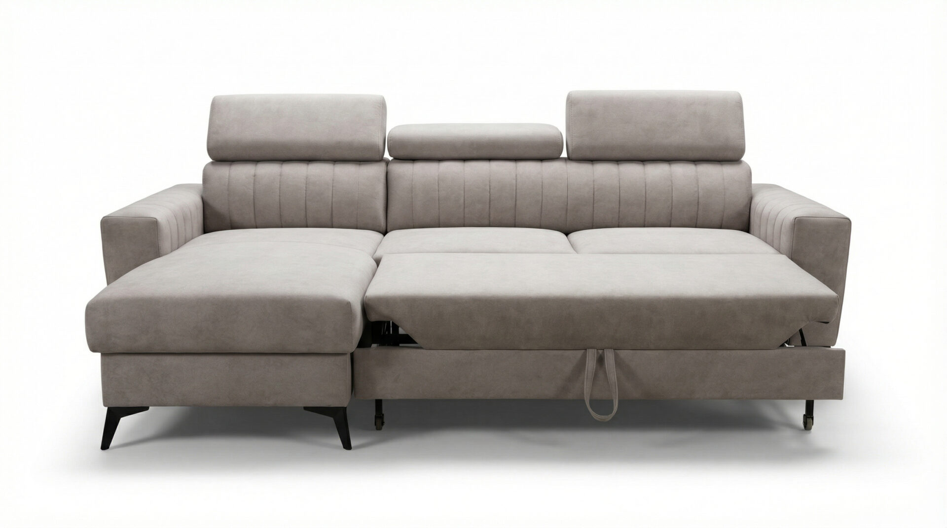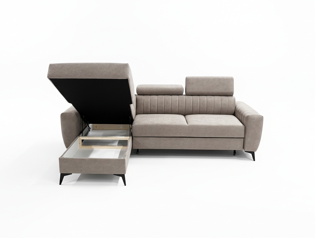 Dzięki automatowi Delfin narożnik Velaro w kilka sekund zmienia się w wygodne łóżko. Pojemnik na pościel pozwala przechowywać koce, poduszki i pościel w zasięgu ręki, utrzymując porządek w salonie.