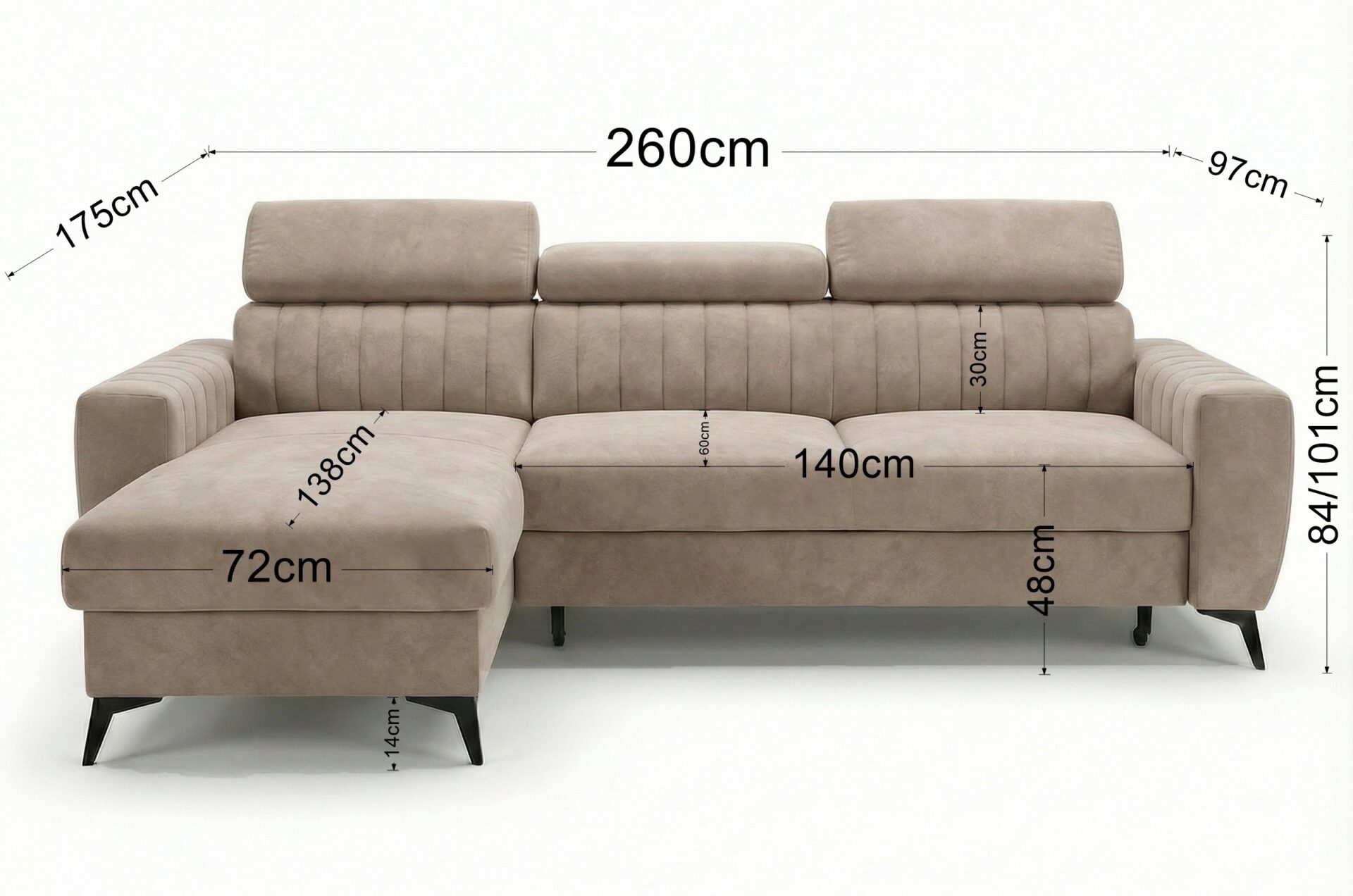 Siedzisko narożnika wykonano ze sprężyny falistej i pianki T30, co gwarantuje wygodę siedzenia i leżenia. Regulowane zagłówki i modne przeszycia pozwalają dopasować narożnik do Twoich potrzeb i nadają mu eleganckiego charakteru.