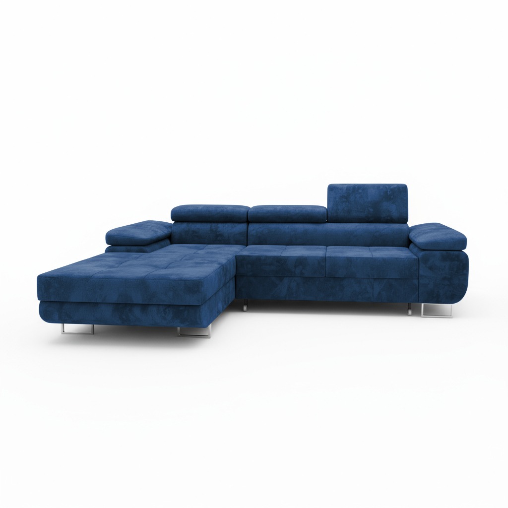 Jego przemyślany układ w kształcie litery L doskonale organizuje przestrzeń w salonie. Wysokie, chromowane nóżki dodają mu wizualnej lekkości. Ułatwiają także utrzymanie czystości pod meblem. Głęboki granatowy kolor tapicerki tworzy we wnętrzu atmosferę spokoju i wyrafinowania. Doskonale pasuje do aranżacji nowoczesnych oraz tych inspirowanych klasyką. Co ważne, tapicerowany tył pozwala ustawić narożnik w dowolnym miejscu, nawet na środku pokoju.