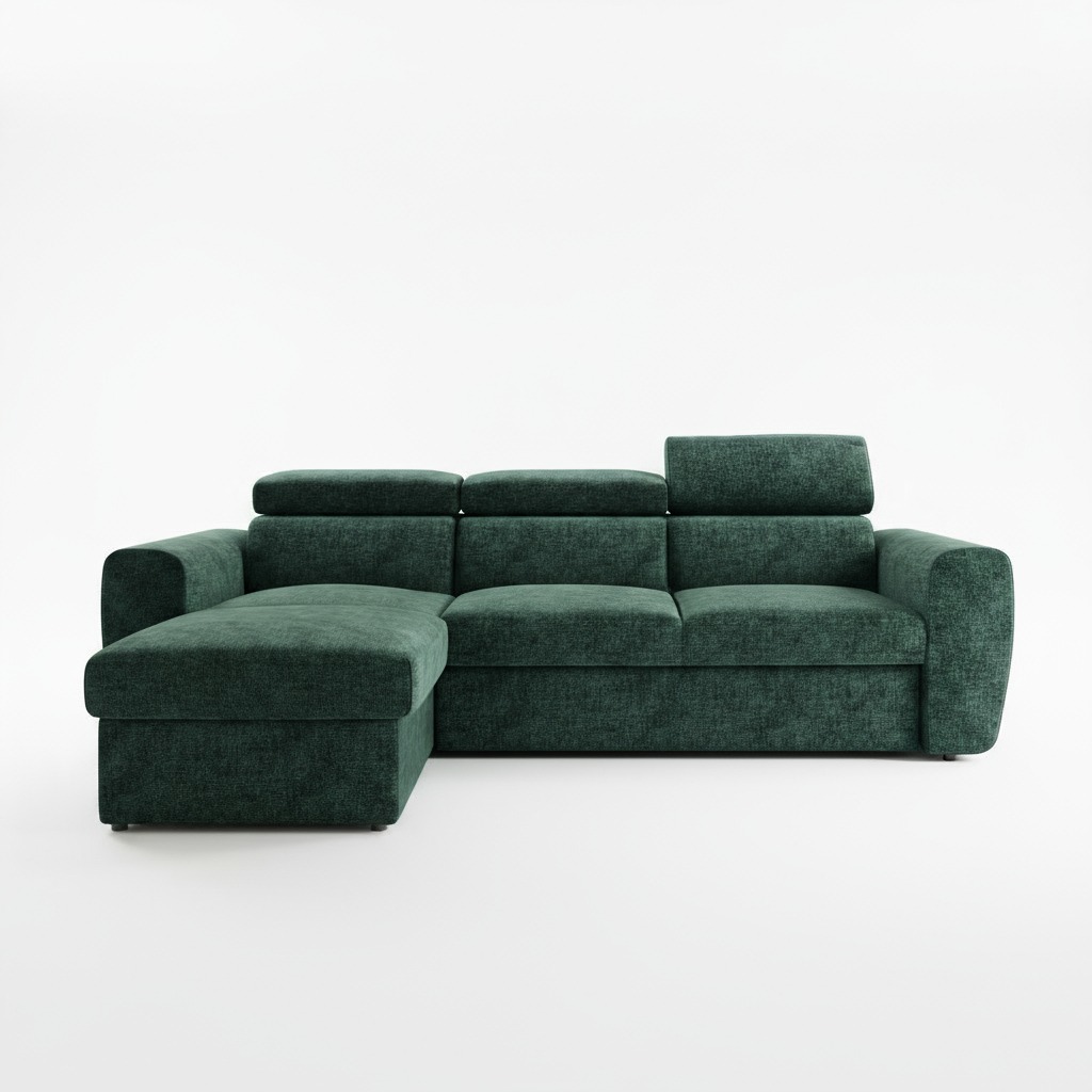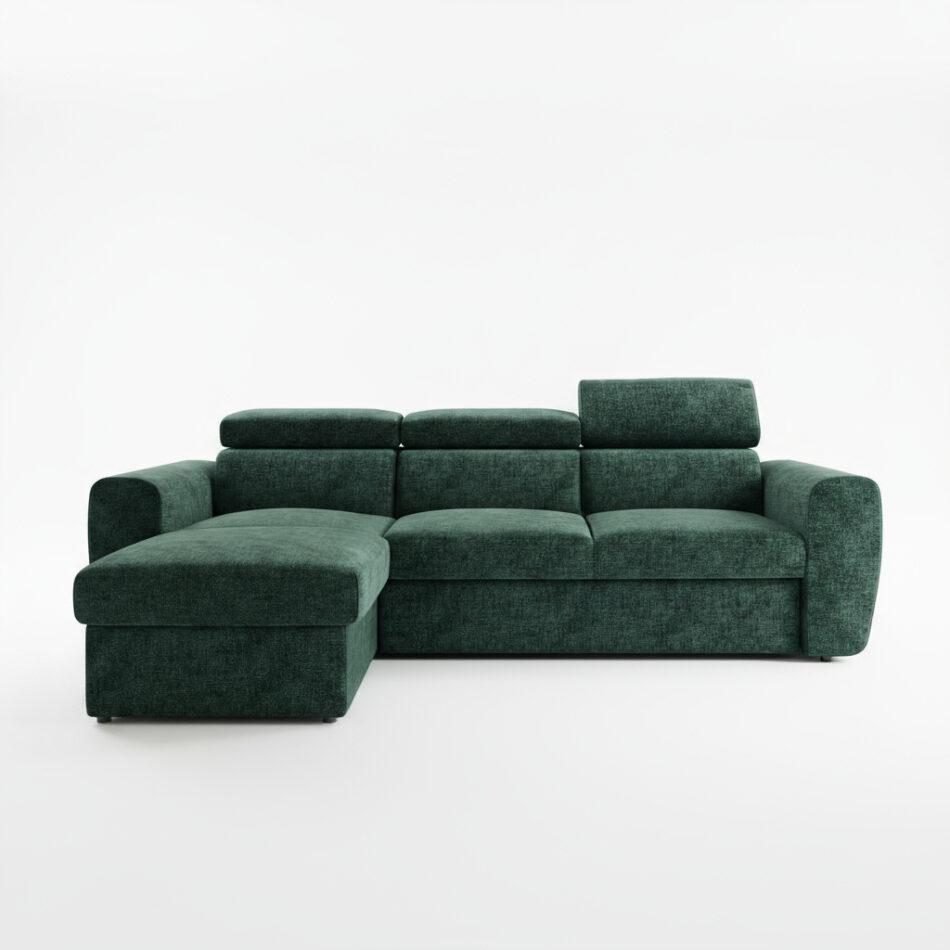 Jego nowoczesna bryła ożywia salon, wprowadzając do niego świeżą energię. Mebel ma kształt litery L, co pozwala na ciekawe i funkcjonalne zaaranżowanie przestrzeni. Głęboki odcień zieleni tworzy w pokoju atmosferę spokoju i bliskości z naturą. Dlatego narożnik doskonale pasuje do wnętrz w stylu boho oraz nowoczesnych, w których królują naturalne materiały.