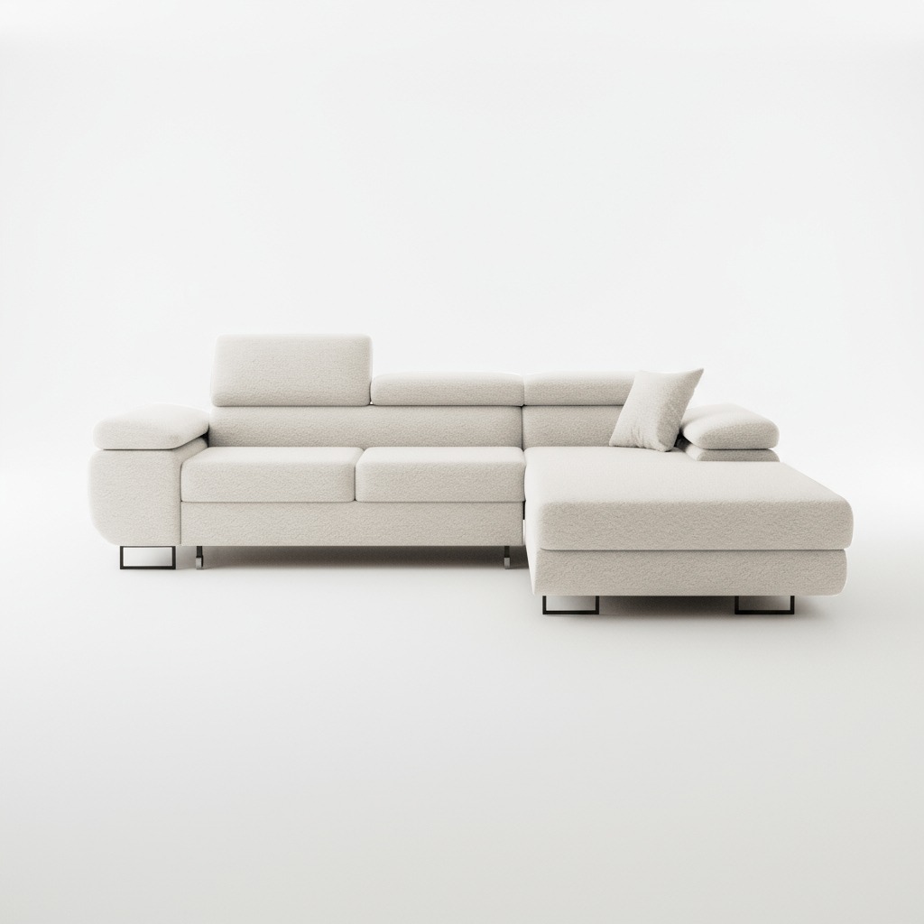 Narożnik został stworzony z myślą o codziennym komforcie. Dlatego siedzisko wypełniono sprężynami falistymi oraz elastyczną pianką. Zapewnia ono stabilne i wygodne podparcie podczas długich wieczorów z serialem. Z kolei regulowane zagłówki pozwalają dopasować wysokość oparcia do indywidualnych potrzeb. Dzięki temu można wygodnie oprzeć głowę podczas czytania książki lub popołudniowej drzemki.
