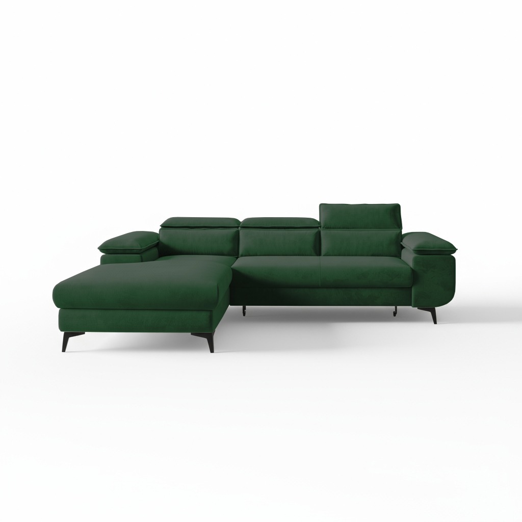 Jego klasyczna bryła w kształcie litery L doskonale odnajduje się w nowoczesnych aranżacjach. Głęboki odcień butelkowej zieleni tworzy przytulną i wyrafinowaną atmosferę. Sprzyja wyciszeniu po długim dniu. Dzięki temu mebel staje się wyrazistym akcentem we wnętrzach urządzonych z drewnem lub złotymi dodatkami. Całość osadzono na wysokich, czarnych nóżkach. Dodają one konstrukcji wizualnej lekkości.
