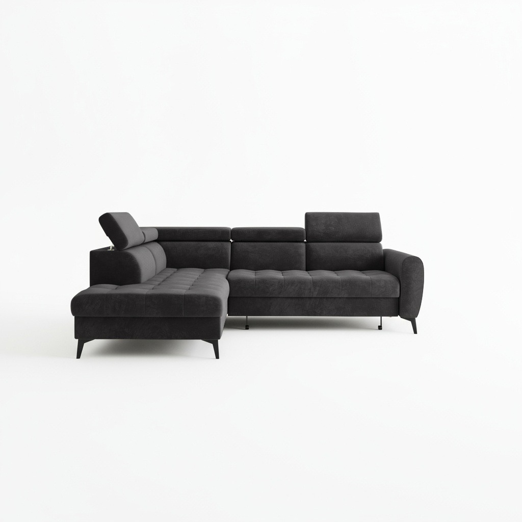 Jego ponadczasowy design w kształcie litery L w naturalny sposób organizuje przestrzeń wypoczynkową. Staje się ona centrum rodzinnych spotkań. Głęboki, grafitowy kolor tapicerki nadaje wnętrzu szyku i spokoju. Dlatego świetnie pasuje zarówno do aranżacji klasycznych, jak i minimalistycznych. Wysokie, chromowane nóżki dodają całej konstrukcji wizualnej lekkości. Co ważne, tapicerowany tył mebla pozwala na ustawienie go w dowolnym miejscu, nawet na środku pokoju.