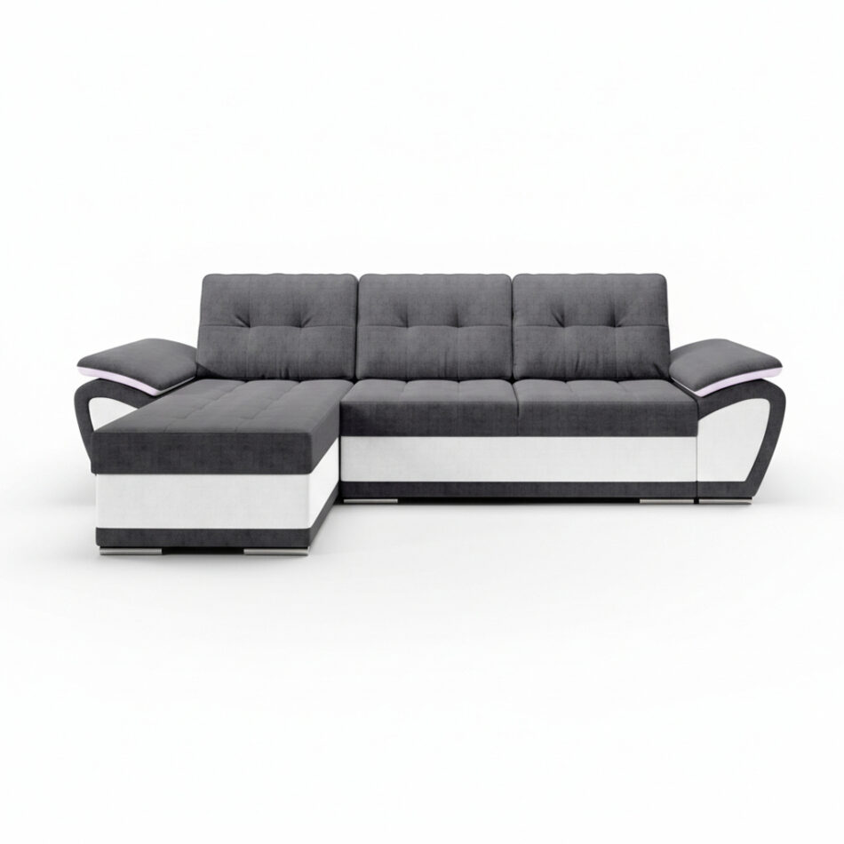 Jego wyrazisty design opiera się na ponadczasowym duecie czerni i bieli. Dzięki temu mebel wprowadza do wnętrza elegancję oraz wizualny porządek. Bryła w kształcie litery L świetnie organizuje przestrzeń. Idealnie pasuje zarówno do aranżacji minimalistycznych, jak i tych inspirowanych stylem glamour. Połączone faktury gładkiej ekoskóry i miękkiego weluru tworzą ciekawy efekt. Co ważne, tapicerowany tył pozwala ustawić narożnik w dowolnym miejscu, także na środku pokoju.