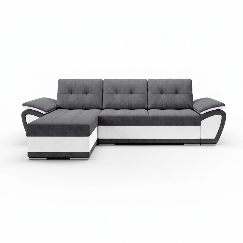Czarno-biały narożnik Enzo jest niezwykle praktyczny w codziennym użytkowaniu. Rozkładanie za pomocą automatu DL jest proste i nie wymaga wysiłku. W ten sposób zyskujemy dużą powierzchnię spania dla gości. Mebel posiada także pojemny schowek na pościel. Dzięki niemu dodatkowe kołdry i poduszki będą zawsze pod ręką. Tkanina welurowa jest przyjazna zwierzętom, a jej czyszczenie jest bardzo łatwe. Dodatkowo utrudnia wchłanianie rozlanych płynów.