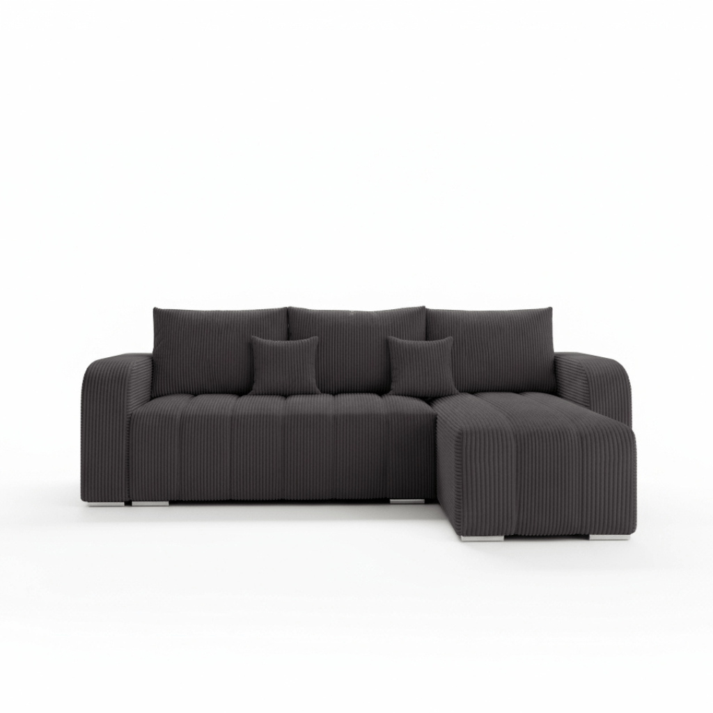 Siedzisko wypełnione sprężynami bonellowymi oraz pianką zapewnia stabilne i wygodne podparcie. Duże, miękkie poduchy oparciowe zachęcają do odpoczynku po długim dniu. Narożnik wyposażono także w intuicyjną funkcję spania. Dzięki niej w kilka chwil można przygotować komfortowe miejsce dla gości. Z kolei pojemny schowek na pościel ułatwia utrzymanie porządku w pokoju dziennym.