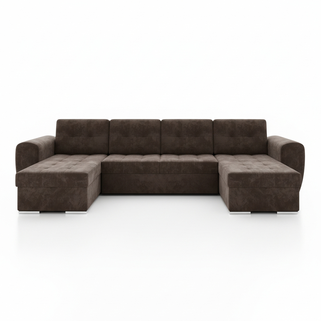 Jego rozłożysta forma naturalnie tworzy centrum domowego życia. Zaprasza do wspólnego spędzania czasu z rodziną lub przyjaciółmi w przestronnym i komfortowym otoczeniu. Głęboki, brązowy odcień tapicerki wprowadza do wnętrza atmosferę ciepła i elegancji. Idealnie pasuje do aranżacji klasycznych oraz nowoczesnych. Dzięki temu salon staje się przytulny i ponadczasowy. Całość wspiera się na niskich, chromowanych nóżkach, które dodają subtelnego, współczesnego blasku.
