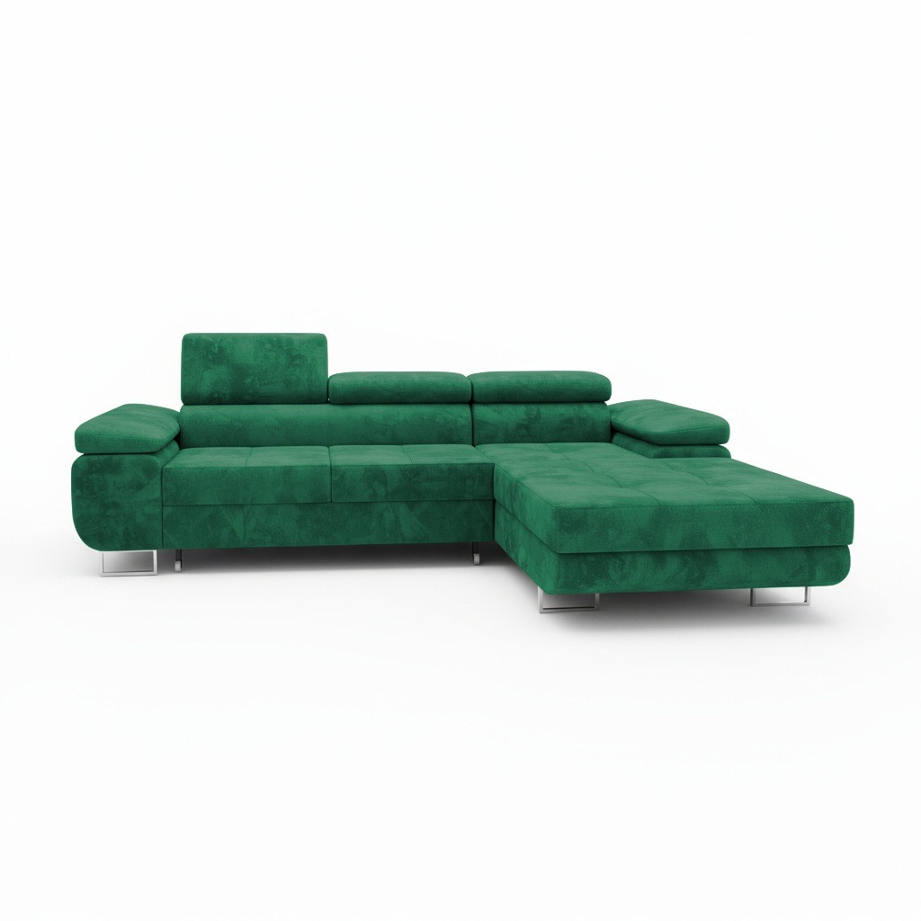 Kolor butelkowej zieleni wnosi do wnętrza spokój i odrobinę luksusu. Ta szlachetna barwa tworzy przytulną, nastrojową atmosferę, sprzyjającą relaksowi po długim dniu. Dlatego narożnik świetnie wygląda zarówno w nowoczesnych, jak i klasycznych wnętrzach. Znakomicie komponuje się z drewnem, złotymi dodatkami lub chłodnymi odcieniami szarości. Wyjątkowy odcień zieleni ożywia przestrzeń, czyniąc ją bardziej wyrafinowaną.
