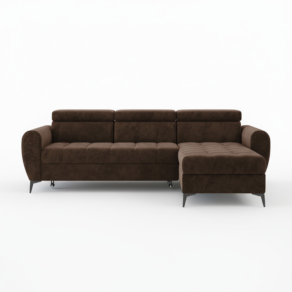 Jego L-kształtny układ doskonale wypełnia przestrzeń salonu. Smukłe, czarne nóżki dodają mu wizualnej lekkości. Dzięki temu bryła nabiera subtelnego charakteru, zachowując stabilność. Ciepły, brązowy odcień wprowadza do wnętrza przytulną atmosferę inspirowaną naturą. Dlatego narożnik świetnie wpisuje się w aranżacje nowoczesne oraz swobodne stylizacje boho.