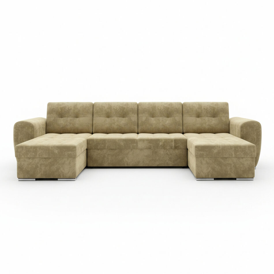 Jego symetryczny kształt tworzy idealne miejsce do spotkań z bliskimi. Ciepły, beżowy odcień tapicerki wprowadza do wnętrza poczucie spokoju i naturalnej elegancji. Dlatego narożnik świetnie komponuje się z aranżacjami w stylu skandynawskim, klasycznym lub minimalistycznym. Całość opiera się na niskich, chromowanych nóżkach, które dodają subtelnej nowoczesności. Co ważne, tapicerowany tył pozwala ustawić mebel w dowolnym miejscu salonu, czyniąc go centralnym punktem aranżacji.