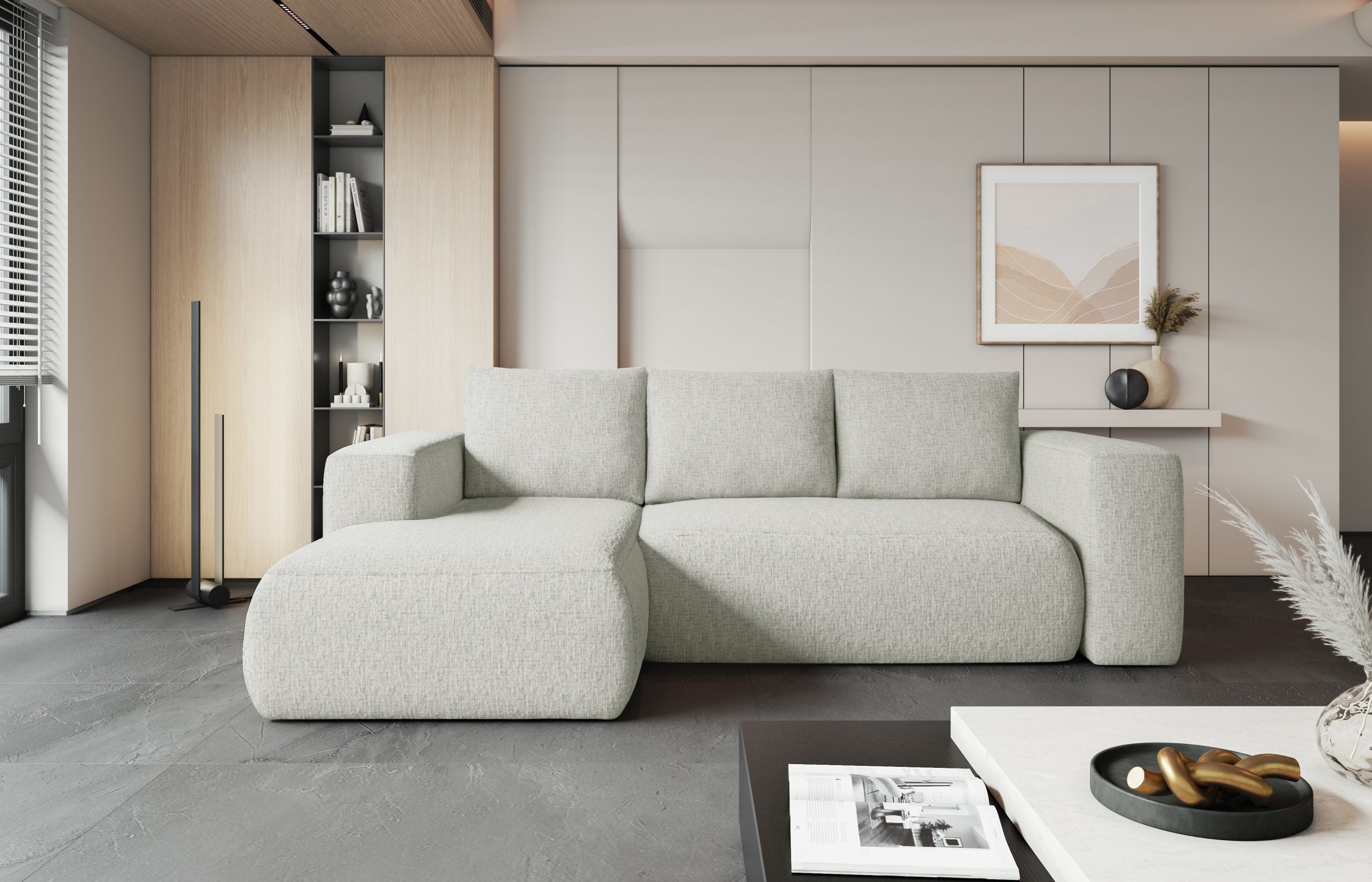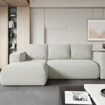 Jego L-kształtna forma doskonale pasuje do nowoczesnych aranżacji inspirowanych stylem boho. Kremowy odcień wprowadza do salonu atmosferę spokoju oraz ciepła. Dzięki niemu wnętrze staje się jaśniejsze i bardziej przestronne. Co ważne, w pełni tapicerowany tył pozwala ustawić mebel w dowolnym miejscu pokoju. W ten sposób zyskujesz pełną swobodę w kształtowaniu swojej przestrzeni.