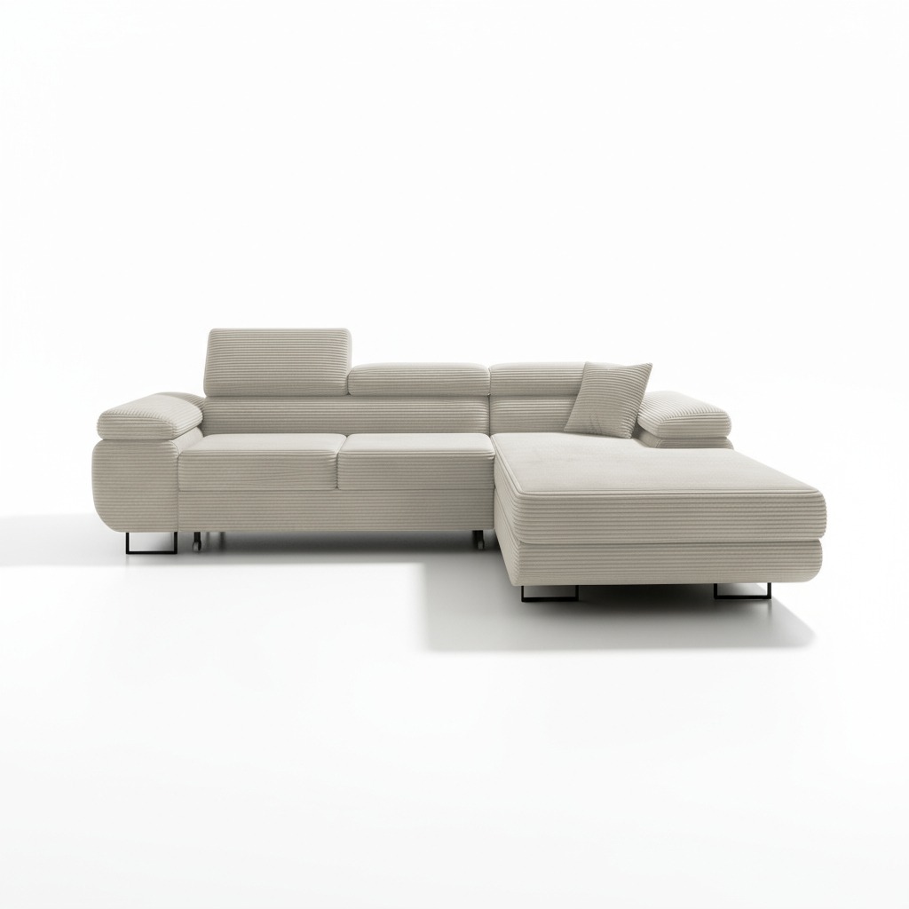 Siedzisko wypełnione sprężynami falistymi i pianką zapewnia stabilne podparcie. Jest idealne do wielogodzinnego wypoczynku z książką lub podczas filmowego seansu. Regulowane zagłówki pozwalają dopasować wysokość oparcia do indywidualnych potrzeb. Dzięki temu każdy domownik znajdzie swoją ulubioną pozycję. Narożnik wyposażono także w funkcję spania. Rozkładanie za pomocą automatu Delfin jest szybkie i nie wymaga siły. W ten sposób salon w kilka chwil zmienia się w komfortową sypialnię dla gości.
