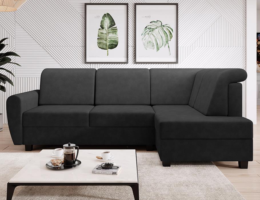 Jego bryła w kształcie litery L doskonale organizuje przestrzeń w salonie. Zapewnia dużo miejsca do odpoczynku dla całej rodziny. Głęboka czerń obicia stanowi wyrazisty akcent dekoracyjny. Dlatego łatwo dopasować go zarówno do wnętrz minimalistycznych, jak i tych z mocniejszymi kolorami. Co ważne, tapicerowany tył pozwala ustawić mebel w dowolnym miejscu. Może on z powodzeniem oddzielać strefę wypoczynkową od jadalni.