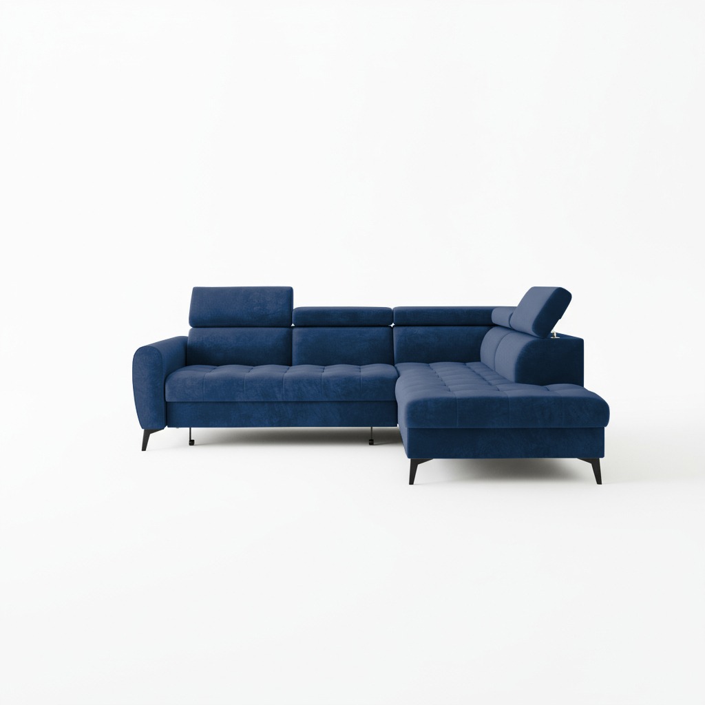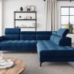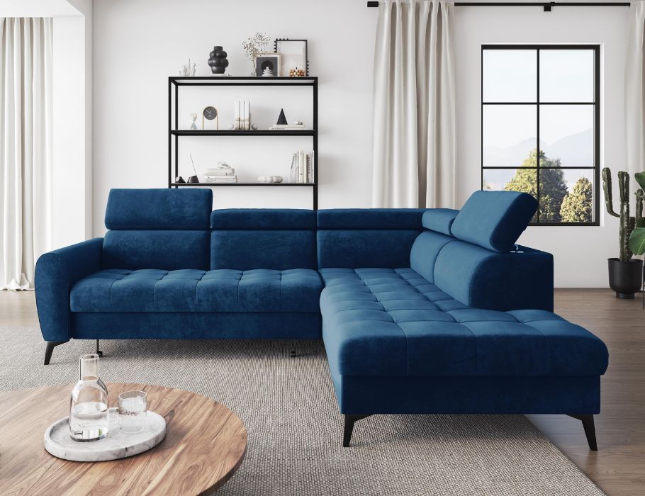 Jego bryła w kształcie litery L doskonale organizuje przestrzeń w salonie. Wysokie, chromowane nóżki dodają jej wizualnej lekkości. Dzięki tapicerowanemu tyłowi mebel prezentuje się znakomicie z każdej strony. Dlatego można go ustawić nawet na środku pokoju. Głęboki, granatowy kolor weluru tworzy atmosferę spokoju i wyrafinowania. Wprowadza do aranżacji szlachetny akcent, który pasuje zarówno do stylu klasycznego, jak i nowoczesnego.