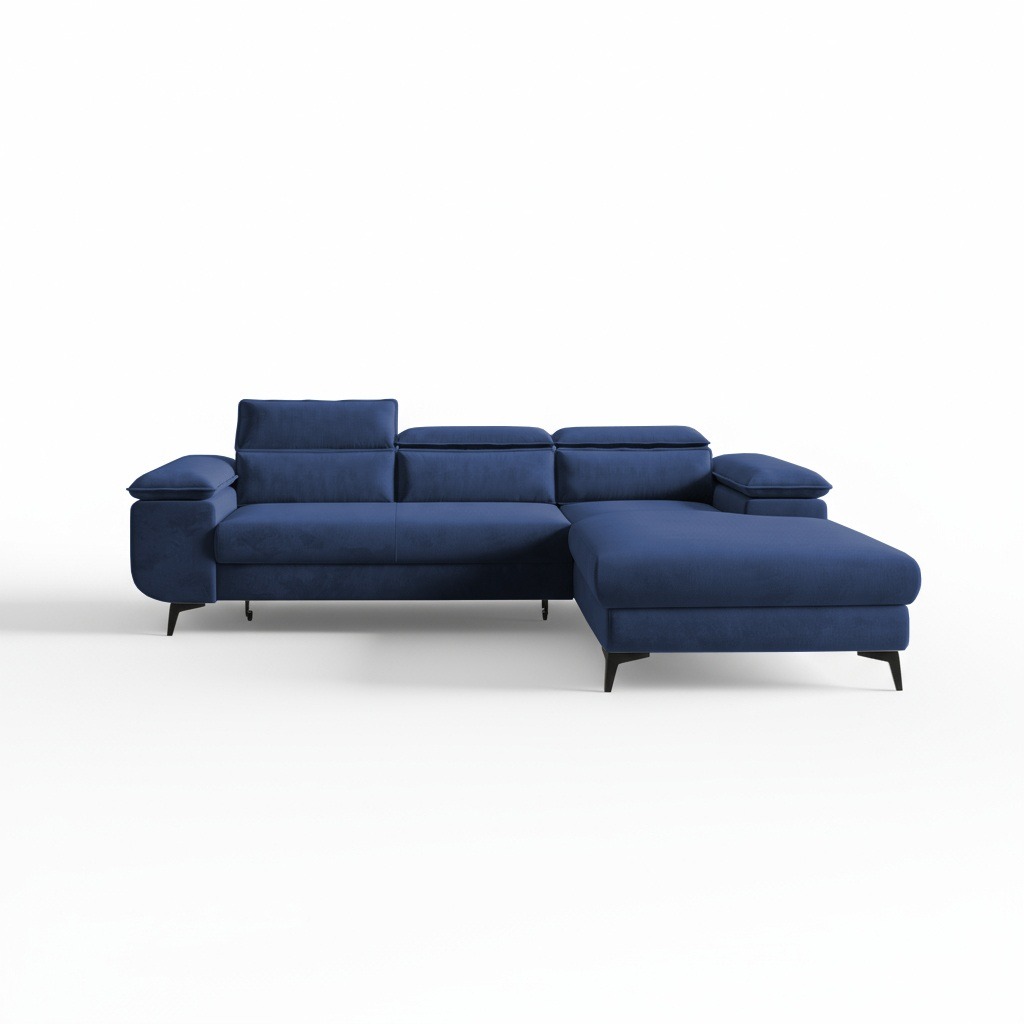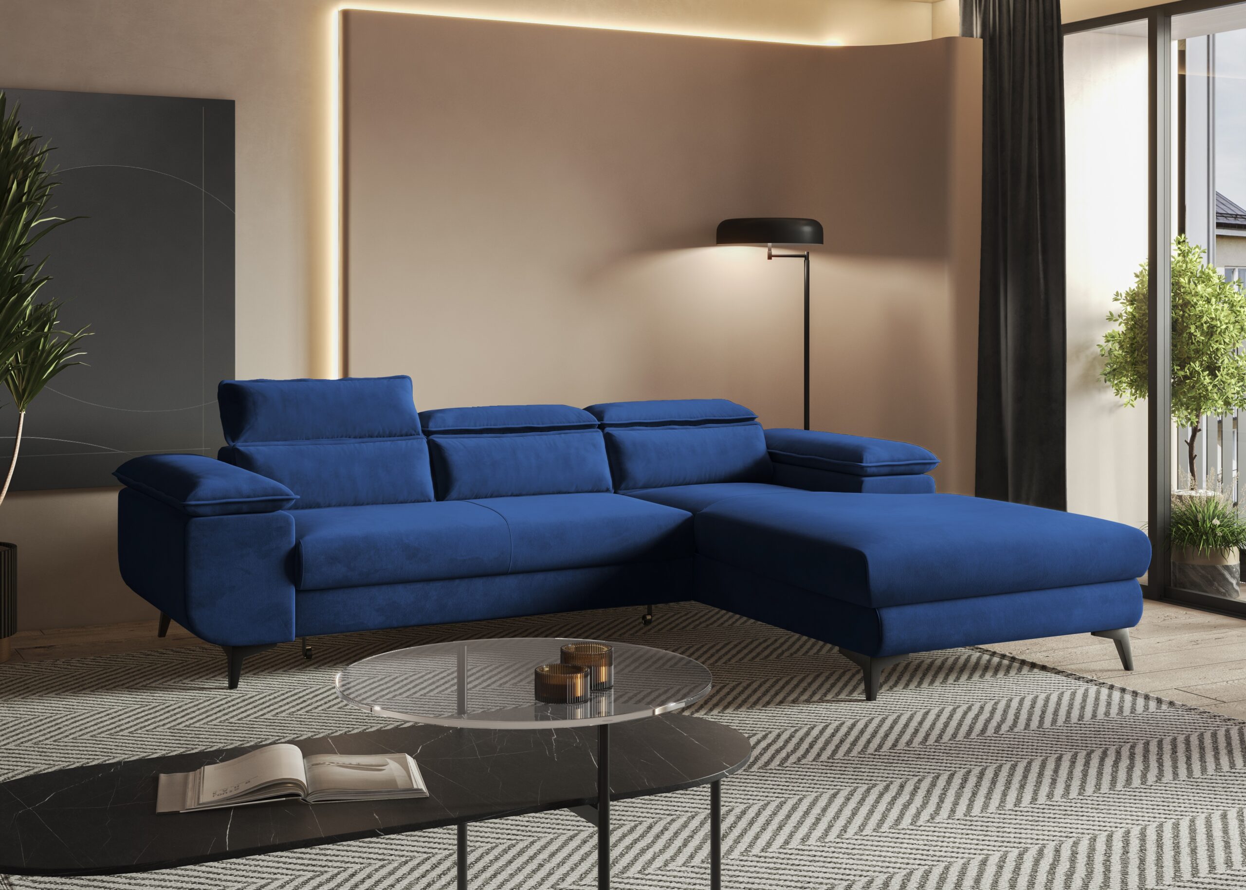 Siedzisko wypełnione sprężynami falistymi gwarantuje komfort i trwałość na lata. Z kolei regulowane zagłówki pozwalają dopasować oparcie do indywidualnych potrzeb. Można je unieść podczas wieczornego seansu filmowego. Albo opuścić, gdy potrzebny jest moment wyciszenia w ciągu dnia. W razie wizyty gości narożnik oferuje funkcję spania. Jej rozkładanie za pomocą automatu Delfin jest szybkie i nie wymaga wysiłku. Duży pojemnik pod siedziskiem pomieści pościel. W ten sposób salon pozostaje zawsze uporządkowany.