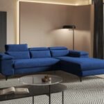 Jego klasyczna bryła w kształcie litery L została osadzona na wysokich, czarnych nóżkach. Dzięki temu mebel zyskuje wizualną lekkość i nowoczesny charakter. Granatowa tapicerka wprowadza do pomieszczenia atmosferę spokoju i wyrafinowania. Kolor ten pięknie komponuje się z drewnem lub metalicznymi dodatkami w stylu industrialnym. Co ważne, tapicerowany tył pozwala ustawić narożnik w dowolnym miejscu salonu, nawet na środku.