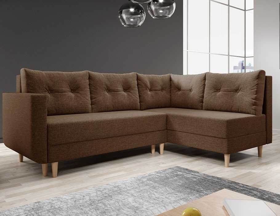 Jego uniwersalny design opiera się na prostej, geometrycznej bryle. Układ w kształcie litery L doskonale organizuje przestrzeń, tworząc wygodne centrum wypoczynku. Głęboki brąz tapicerki wprowadza do wnętrza atmosferę ciepła oraz bezpieczeństwa. Dlatego mebel ten świetnie odnajdzie się w aranżacjach klasycznych i nowoczesnych. Wysokie nóżki z drewna bukowego dodają mu wizualnej lekkości. Co ważne, tapicerowany tył pozwala ustawić narożnik w dowolnym miejscu, nawet na środku pokoju.